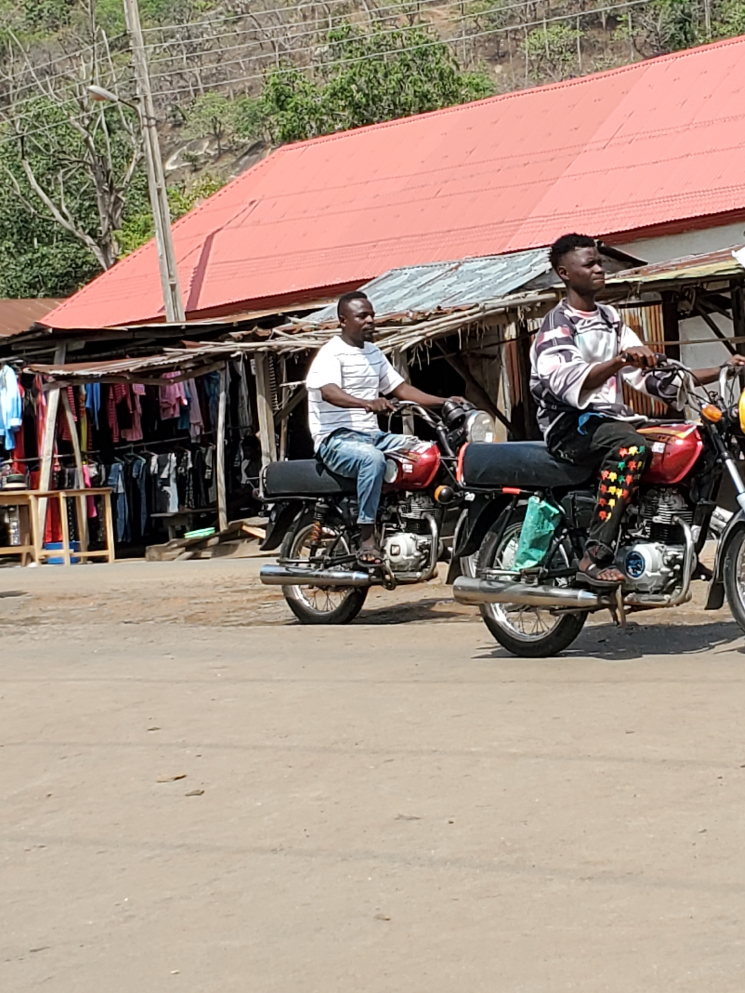 Two men are depicted sitting on motorcycles parked alongside a street in Mararaba, Nigeria, under bright daylight. The image is rotated 90 degrees clockwise from its natural orientation. In the foreg…read more