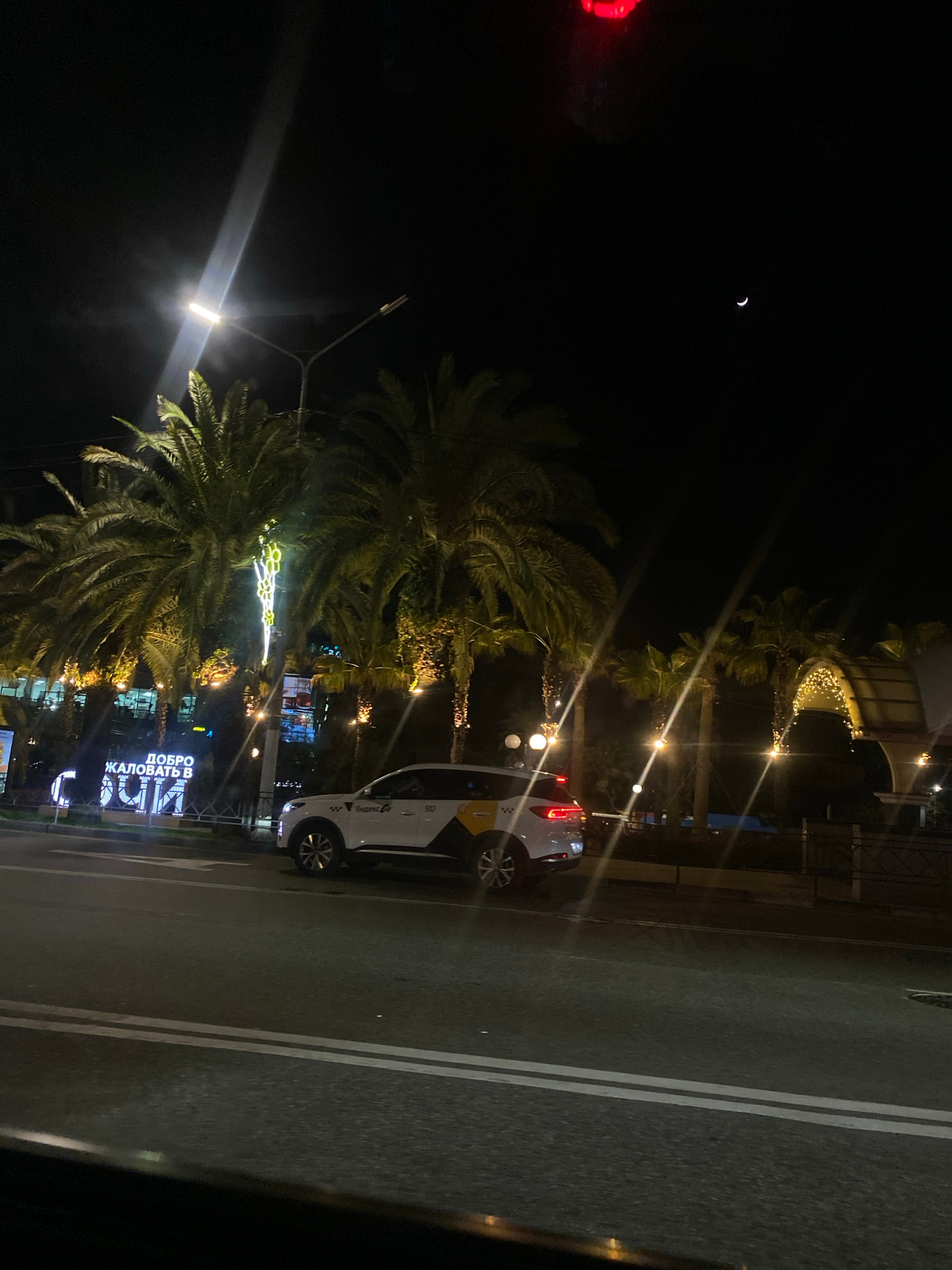 The image presents a vibrant nighttime street scene in Sochi, Russia. The setting is dark, with a clear crescent moon visible in the upper left portion of the sky. The scene features a street lined w…read more