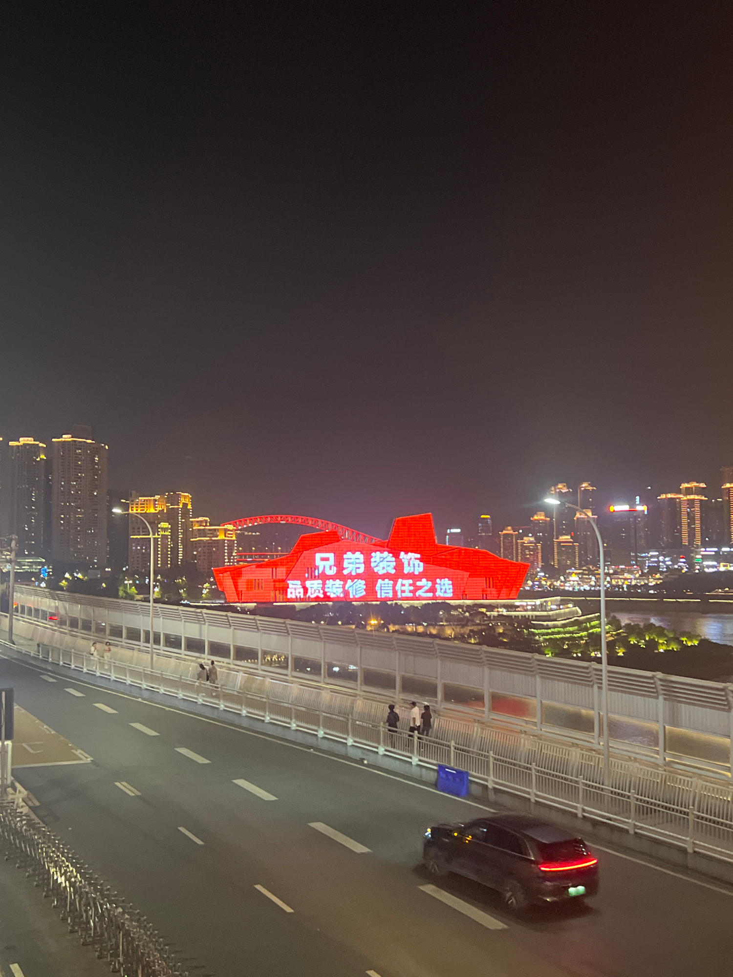 This nighttime, oblique-angle image, taken from an elevated position, depicts a cityscape in Yuzhong District, China. A bridge occupies the foreground, with a black sedan positioned on the right side…read more