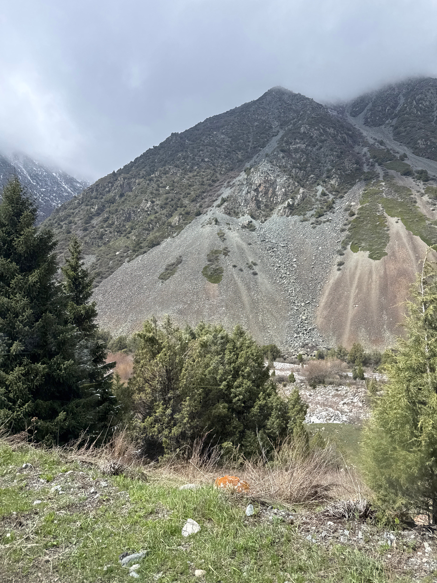 The image shows a mountain landscape in Kashka Suu, Kyrgyzstan. A steep, rocky mountain slope dominates the scene, partially obscured by clouds at its peak. A significant scree slope extends downwards…read more