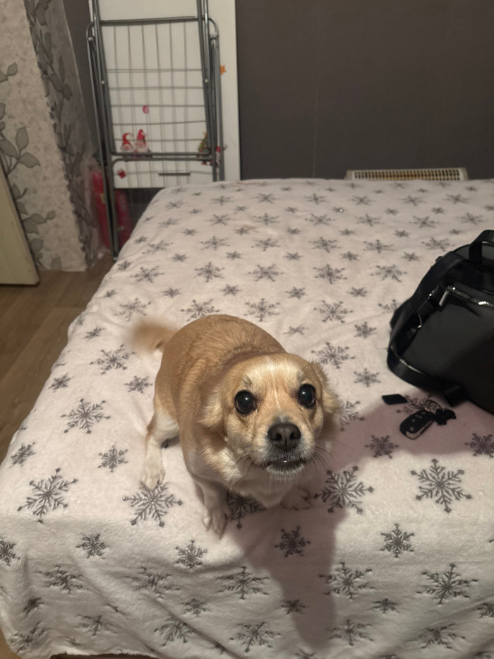 The scene depicts an interior domestic setting in Pernik, Bulgaria. A small, light brown short-haired canine, consistent with a Chihuahua mix, is positioned on a bed in the mid-ground, facing directly…read more