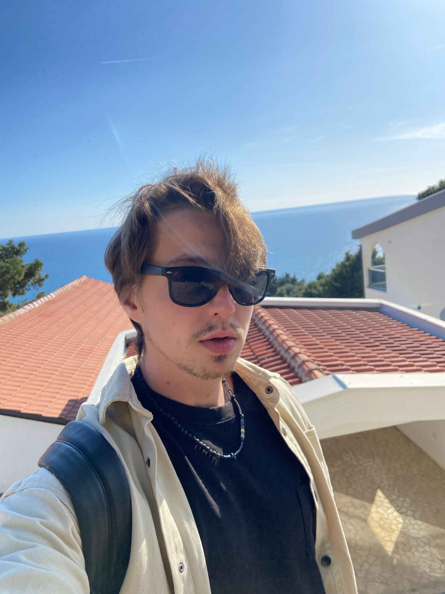 A person with light brown hair and sunglasses is facing the camera. They are wearing a black t-shirt and a light-colored jacket. A beaded necklace is visible around their neck. The background includes…read more