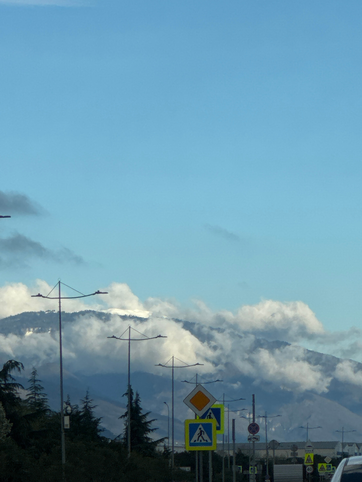 The image presents a scene from Sochi, Russia. The sky is a bright blue, with white clouds scattered towards the right of the frame. The right side features roadside infrastructure, including trafficβ¦read more