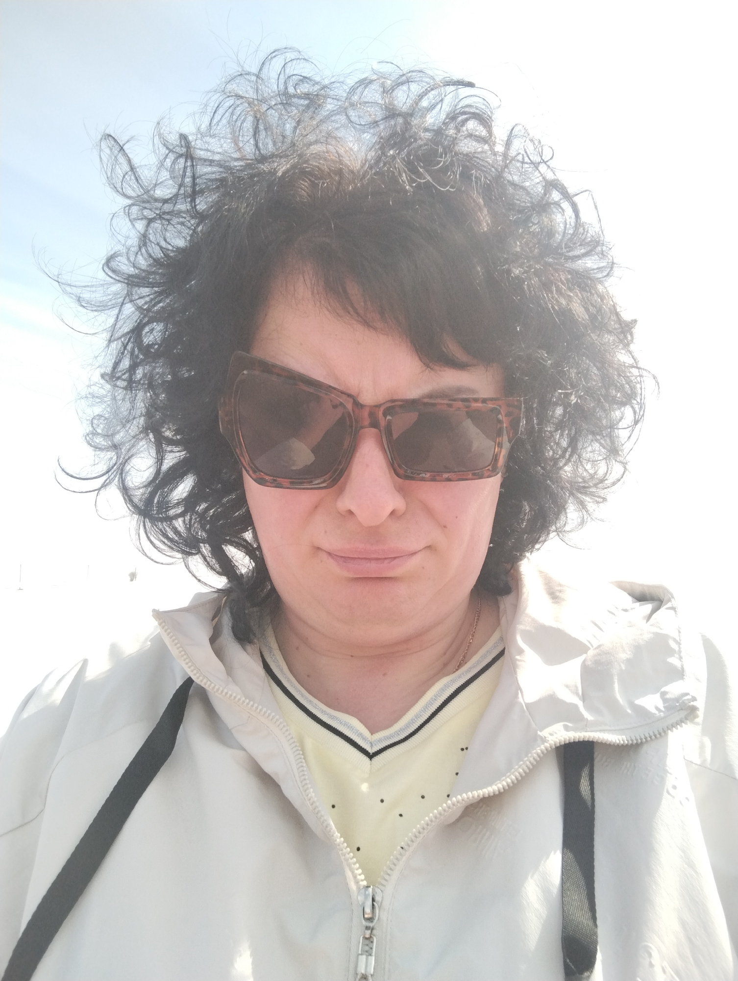 A woman is centered in a high-angle, close-up shot. She has curly, dark hair and wears oversized, patterned sunglasses. Her face is partially obscured by the glasses, but her expression appears neutra…read more