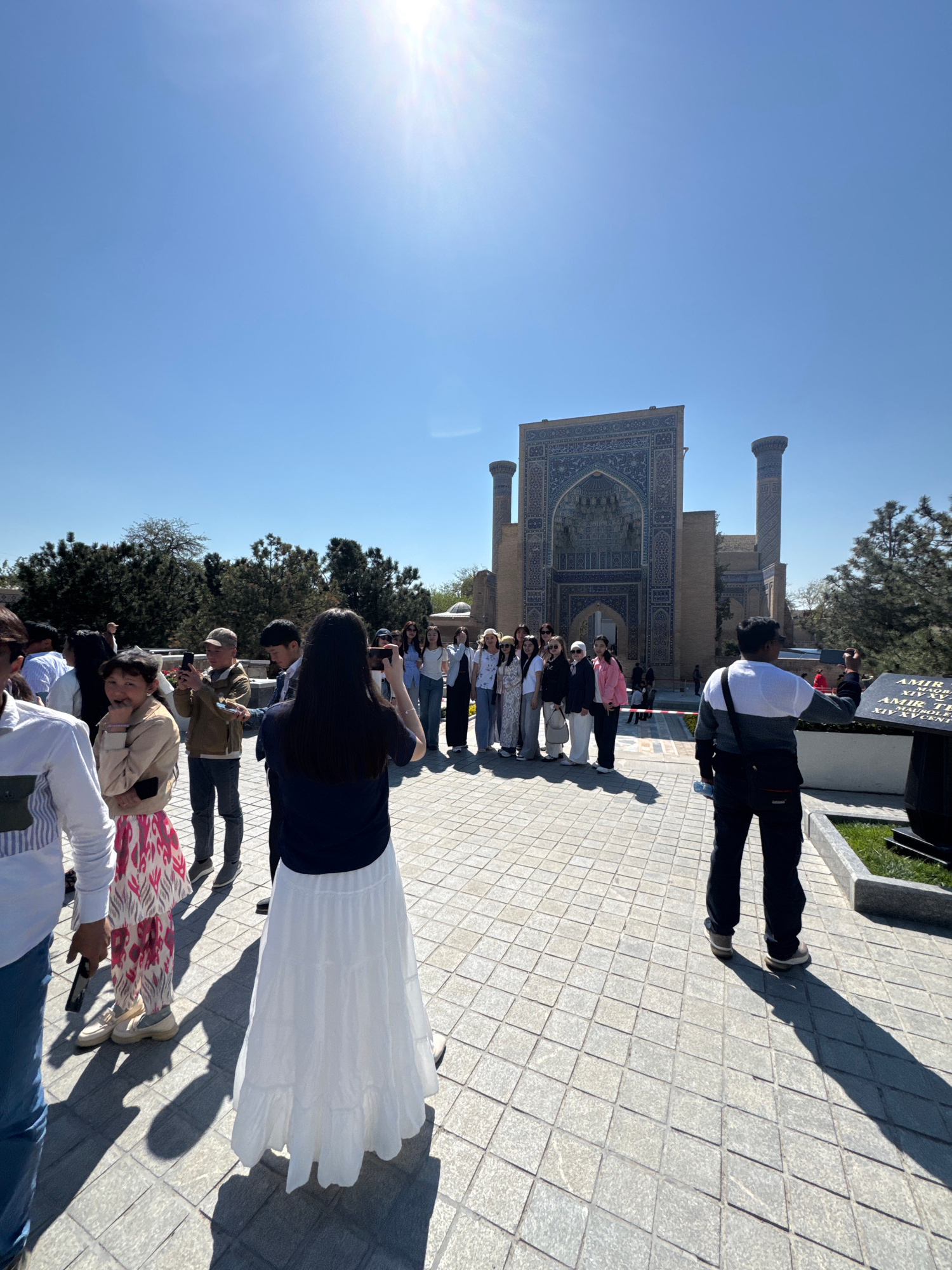 A bright outdoor scene shows tourists in front of the Gur-e-Amir Mausoleum in Samarkand City, Uzbekistan. The building has a large, decorated archway flanked by two minarets. The foreground is filled…read more