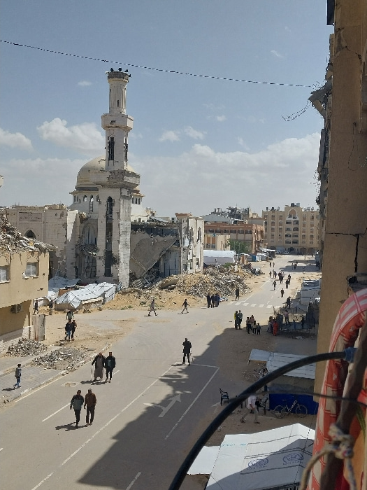 The image depicts a broad street in Khan Yunis, Palestinian Territory, under a clear sky with scattered white clouds. The scene is characterized by significant urban destruction. In the center-left,…read more