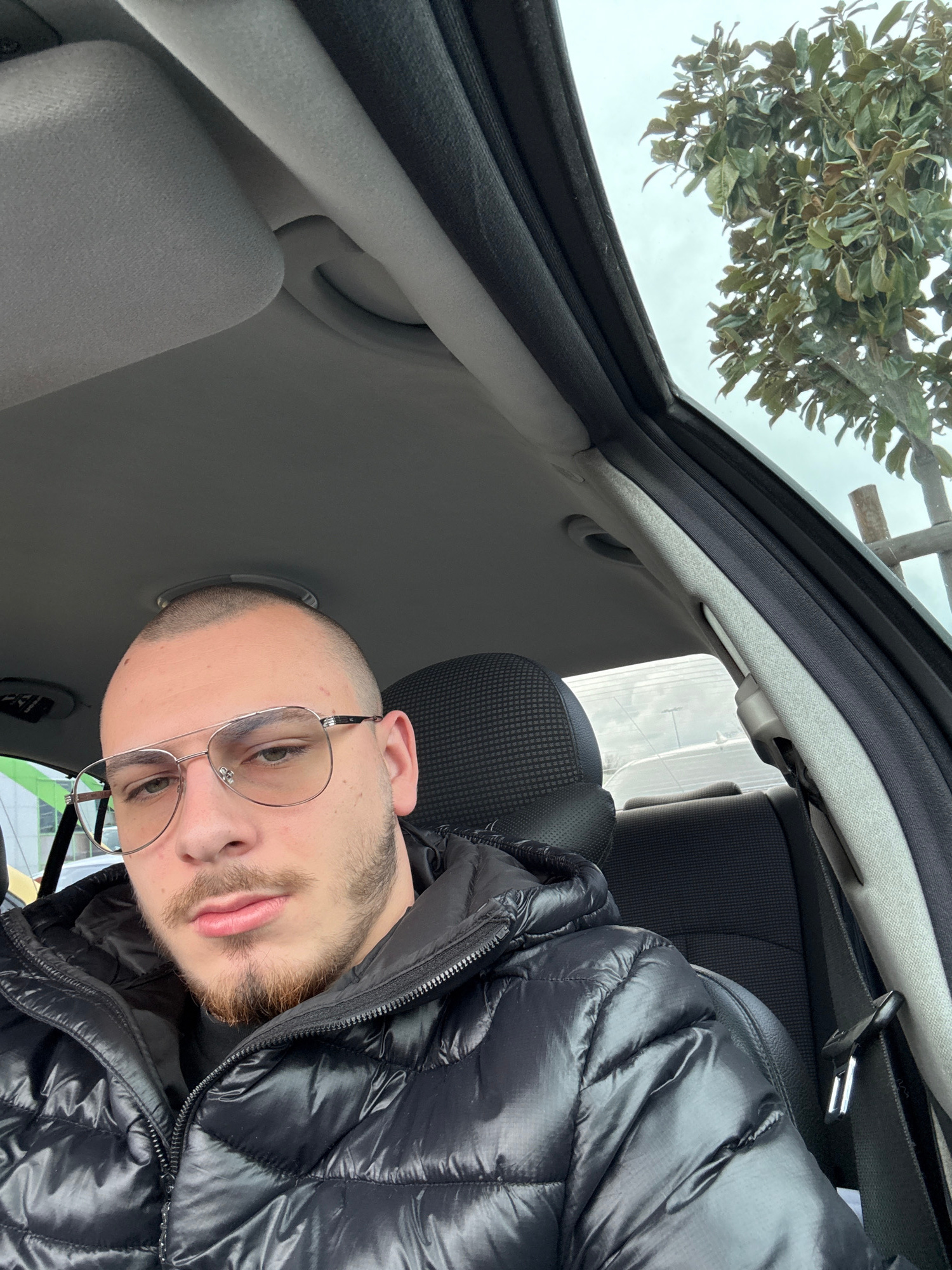 A male individual with a shaved head, light brown beard, and aviator-style eyeglasses is seated in the front passenger seat of a vehicle. He is wearing a shiny black puffer jacket. The vehicle's inter…read more