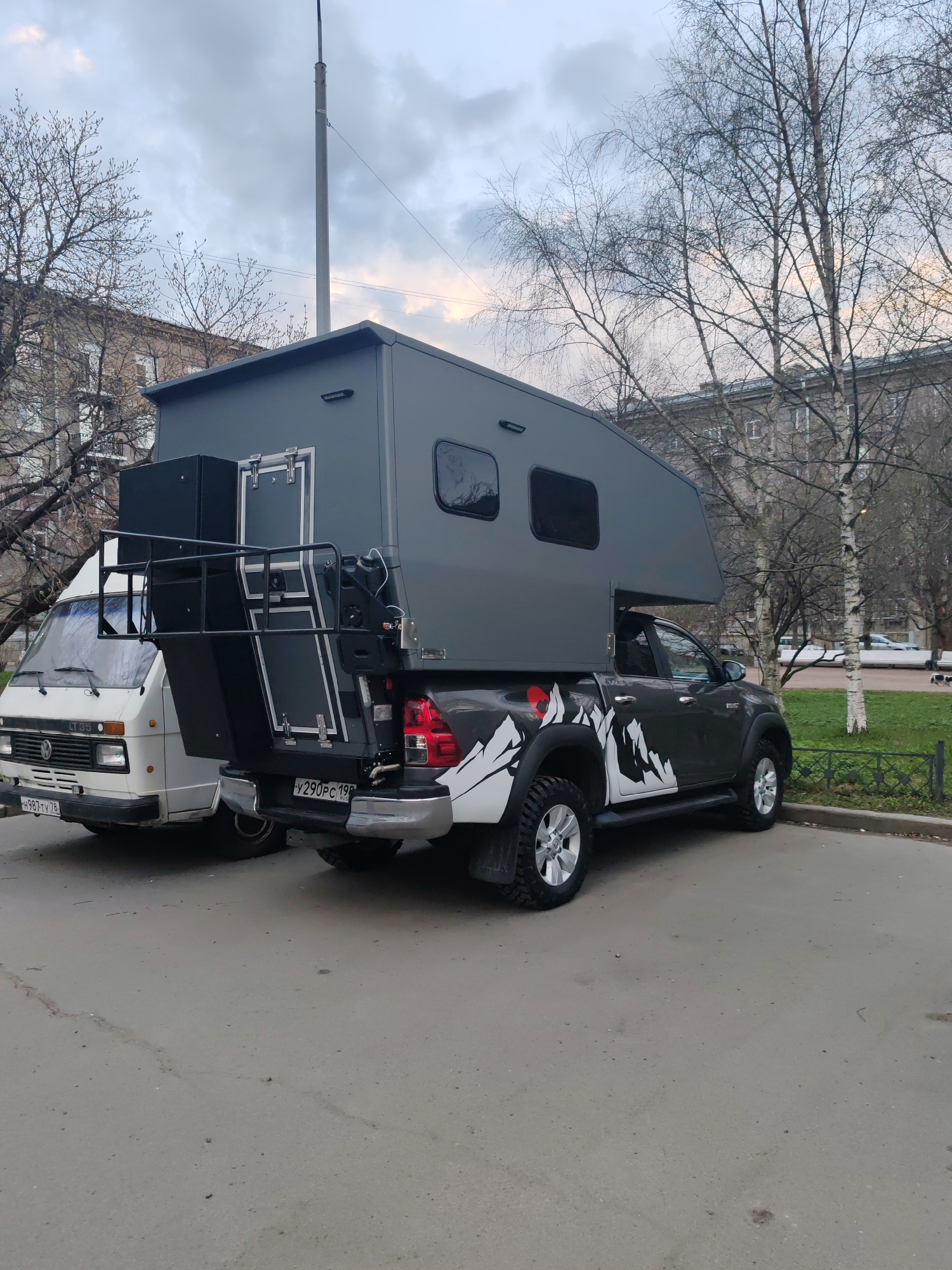 The image presents two customized vehicles parked on an asphalt surface in an urban setting, likely Saint Petersburg, Russia, given the visible license plate region codes (198 and 78). The sky is over…read more