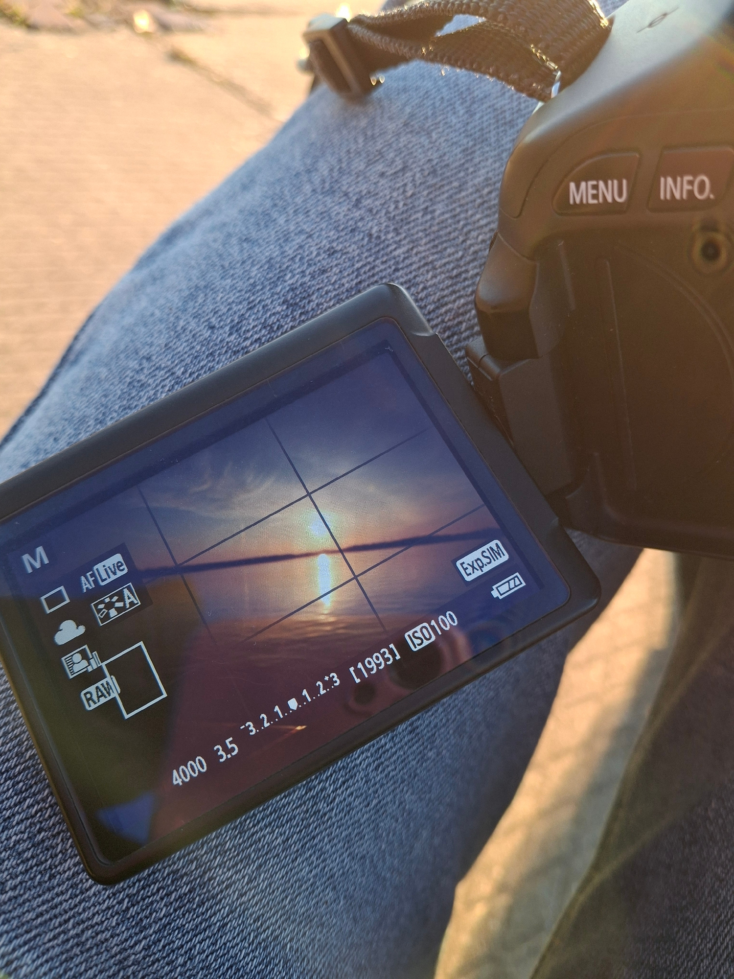 The image shows a camera resting on a person's lap, who is wearing blue denim jeans, under bright, direct sunlight. The scene appears to be outdoors, with blurred light-colored ground or pavement visi…read more