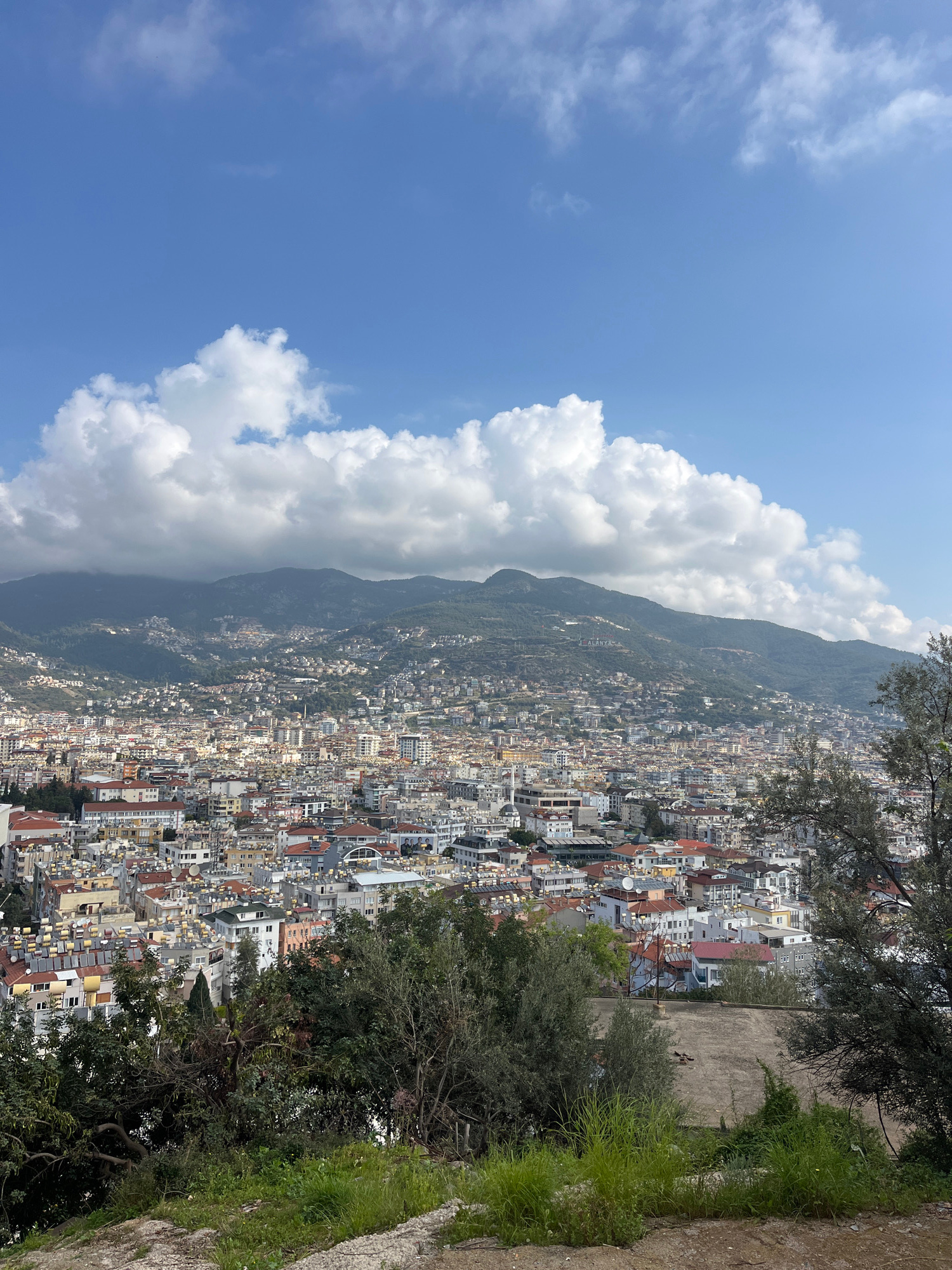 The image depicts a panoramic view of the city of Alanya, Turkey, observed from an elevated position. The scene is dominated by a dense urban landscape extending towards the base of a significant moun…read more