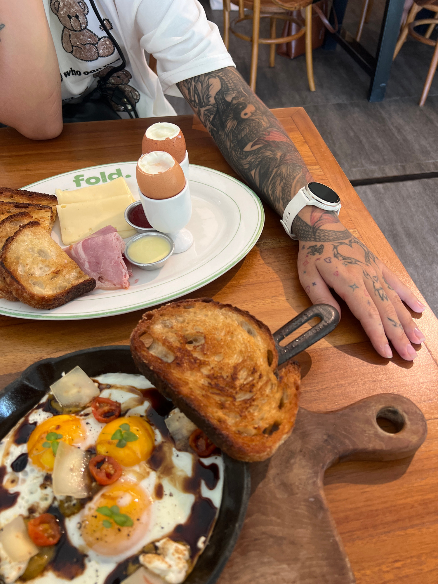 A top-down shot depicts a wooden table setting in what appears to be a restaurant in North Kuta, Indonesia, with a partially visible person with a heavily tattooed arm and hand positioned near the foo…read more