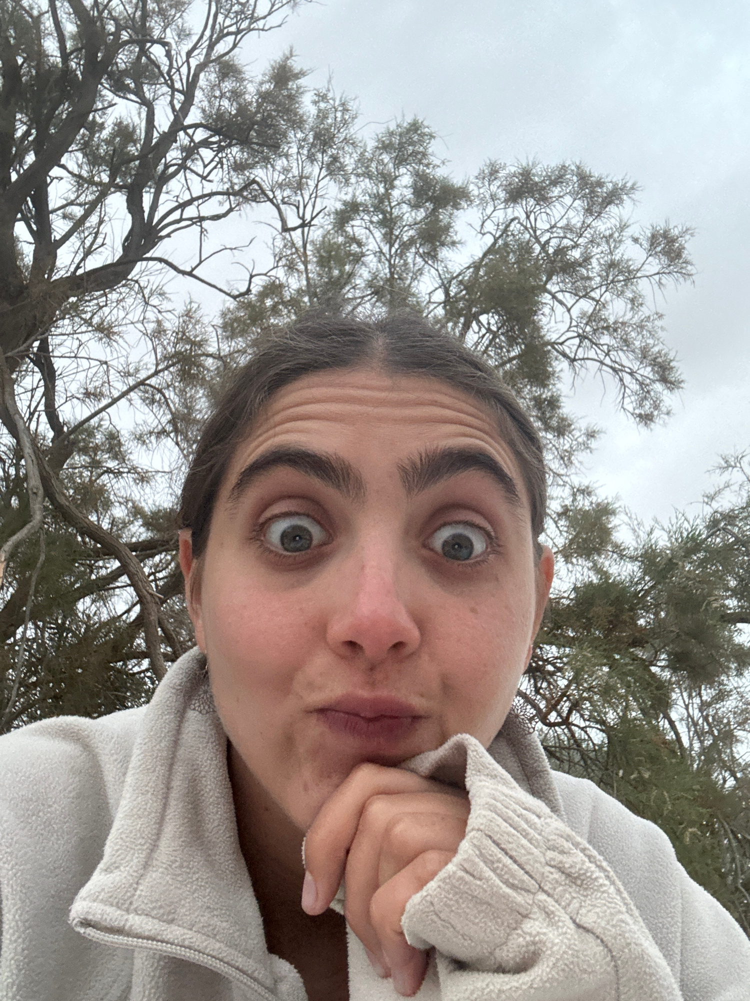 A close-up selfie of a woman is taken outdoors, possibly in Hevel Eilot Regional Council, Israel. She is wearing a light-colored, fleece-like jacket and has her hand near her face. Behind her are bare…read more