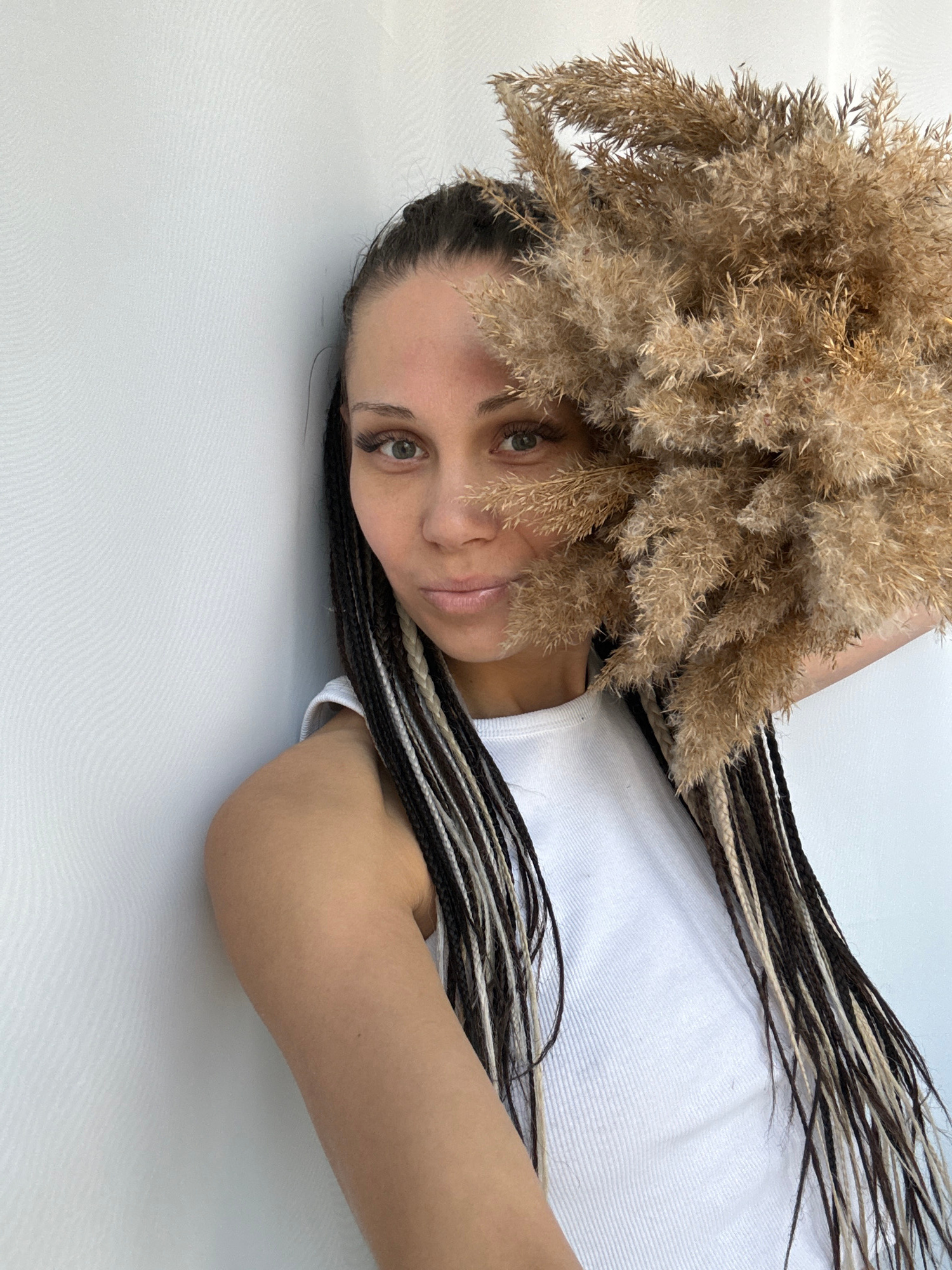 A woman with braided hair lies on a white surface. She is wearing a white shirt and is partially obscured by a large bundle of dried grass. The location is assumed to be Rusanovo, Russia.