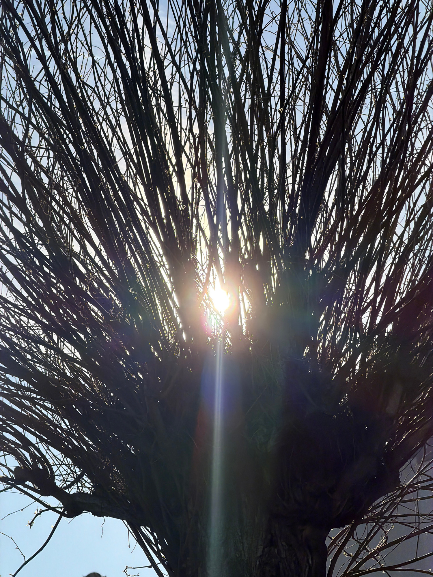 The image depicts a view looking upward through the tangled branches of a tree, with the sun shining through the gaps in the branches. The branches are dark and appear to be bare. The sky is visible b…read more