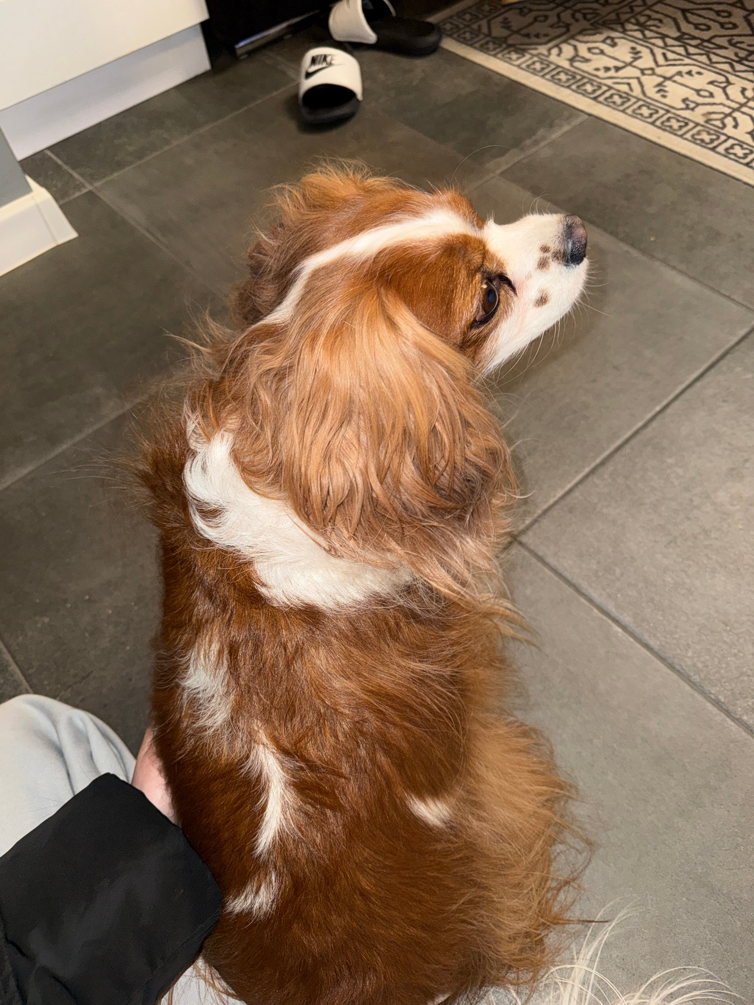 A Cavalier King Charles Spaniel lies on a gray tiled floor next to a patterned rug. The dog has a brown and white coat. A pair of black and white Nike sandals are visible near the rug. A person wearin…read more