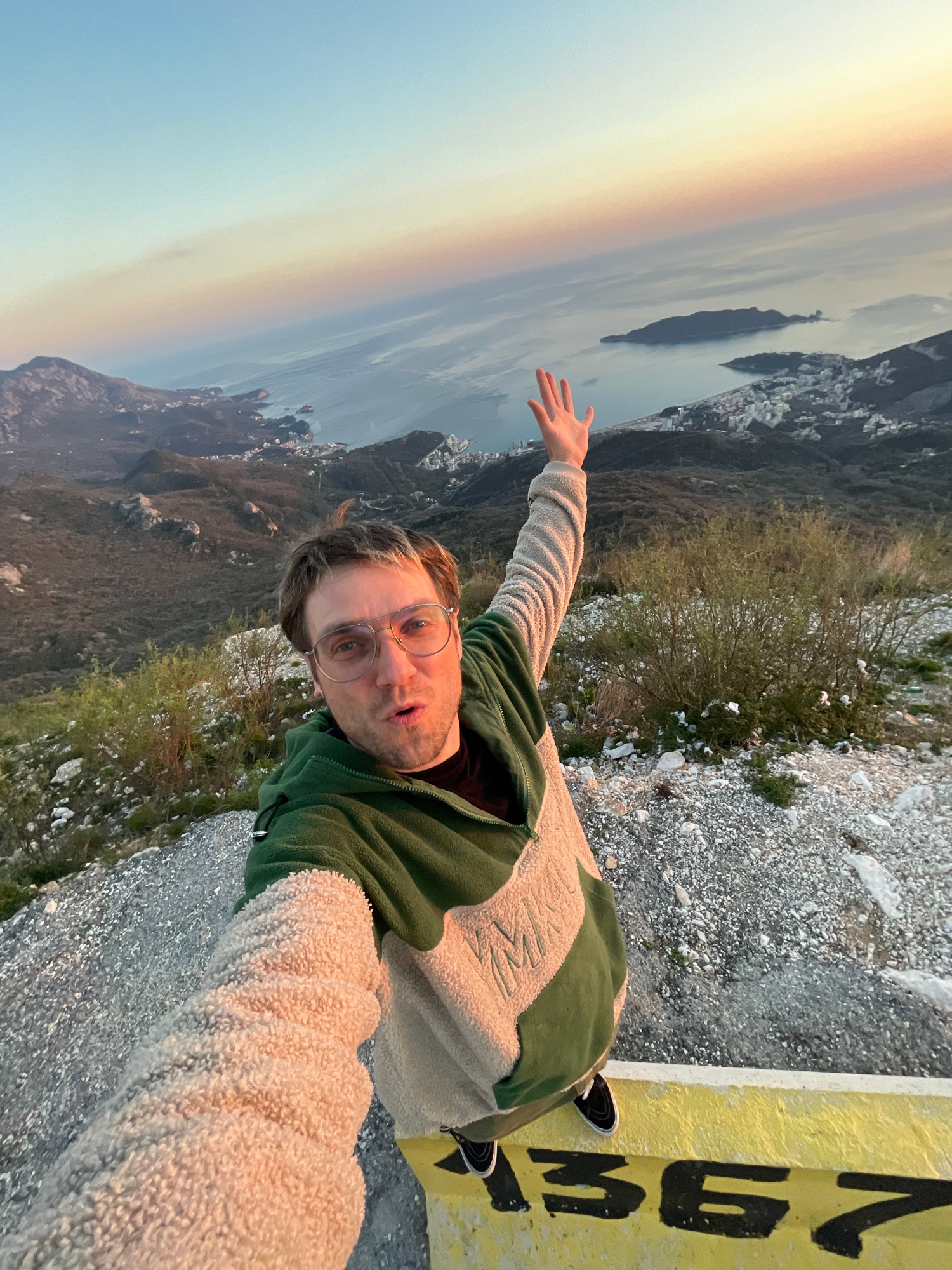 A selfie depicts a man wearing glasses, a green and beige jacket, and black shoes. He stands on a gray, rocky surface beside a yellow stripe with black lettering, with the word "MEM" being visible. In…read more
