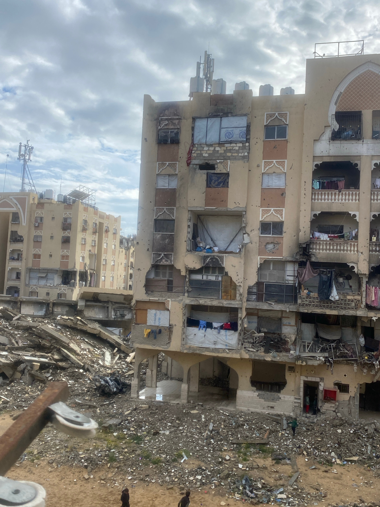 The image depicts an extensively damaged urban environment in Khan Yunis, Palestinian Territory, under an overcast sky. In the foreground, a rusted metal arm with two white pulleys extends from the lo…read more