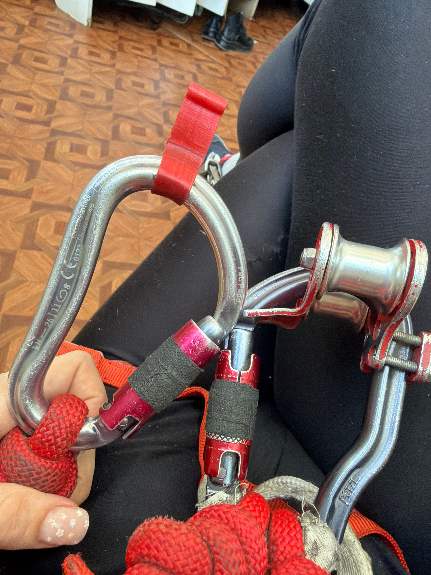 Here's a detailed description of the image, focusing on the observable details: **Scene Overview:** The image appears to be a close-up shot of climbing or rigging equipment held in someone's hand. Th…read more