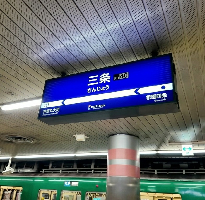 The image displays an interior view of an underground train station platform, identified as Sanjo Station (KH40) on the Keihan Main Line in Kyoto, Japan. A prominent, illuminated blue sign hangs from…read more