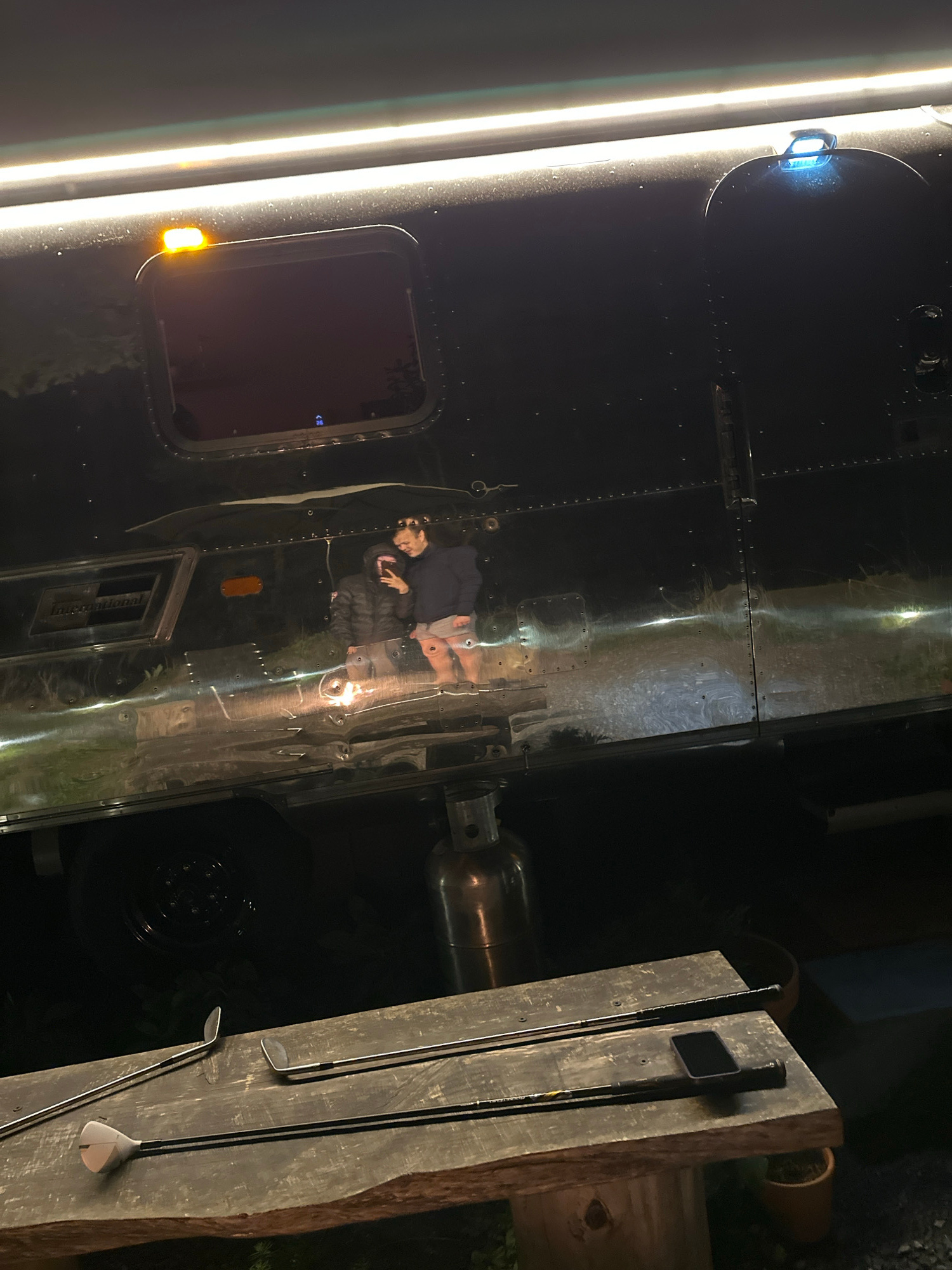 The image shows the side of a shiny, dark semi-trailer, likely an International model based on a badge visible on its side. The trailer reflects a couple, possibly embracing or posing for a photo. The…read more