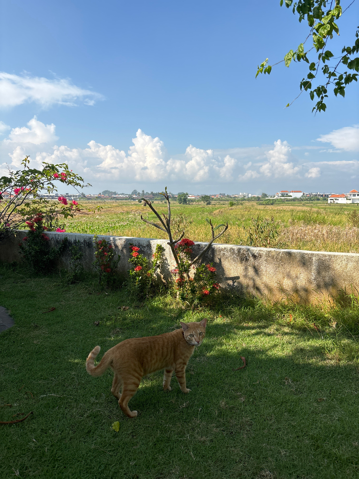 The image, captured in Cemagi, Indonesia, presents a landscape divided into three distinct horizontal layers. The top layer consists of a bright blue sky interspersed with puffy white clouds and the g…read more