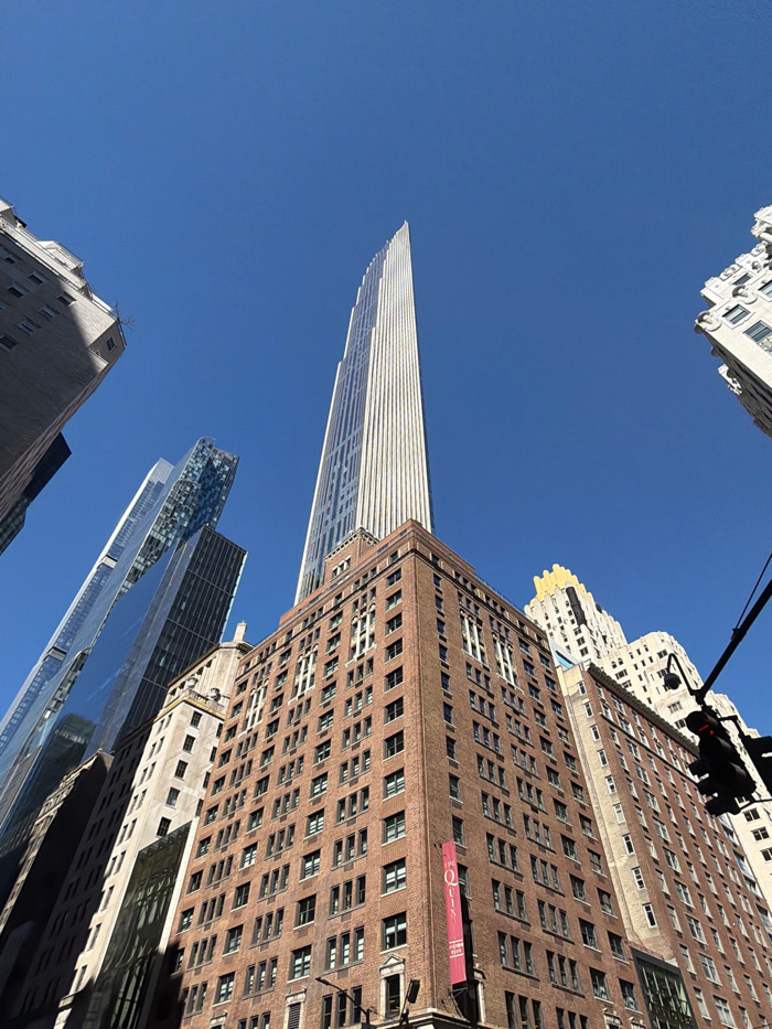 This image depicts a low-angle view of multiple skyscrapers in Midtown Manhattan, New York City, United States of America, under a clear, bright blue sky with no clouds. In the center-right, the extr…read more