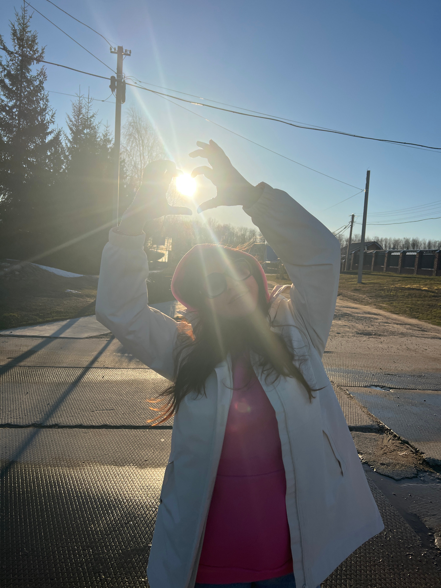 A young woman in a pink shirt and white jacket poses with her hands near the sun, obscuring her face. The background features a blue sky, power lines, trees, and a building. The location is outdoors,…read more