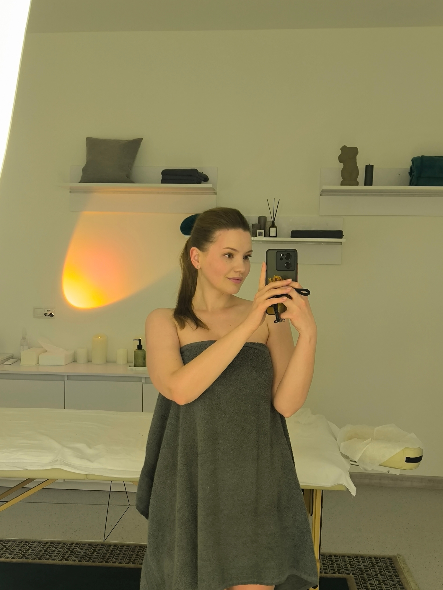 A young woman with light skin and brown hair pulled back into a ponytail stands in what appears to be a spa or salon room, taking a selfie with a smartphone. She is wrapped in a gray towel that covers…read more