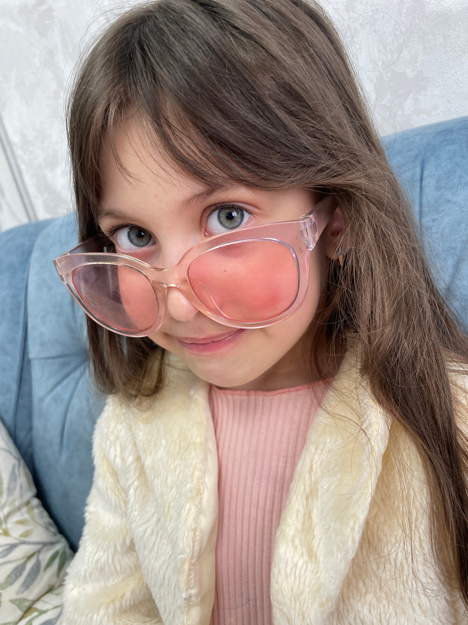 A young girl with long brown hair is shown at a tilted, close-up angle, wearing pink-tinted glasses. She has light skin and grey-blue eyes. She is wearing a light pink shirt and a cream-colored, plush…read more