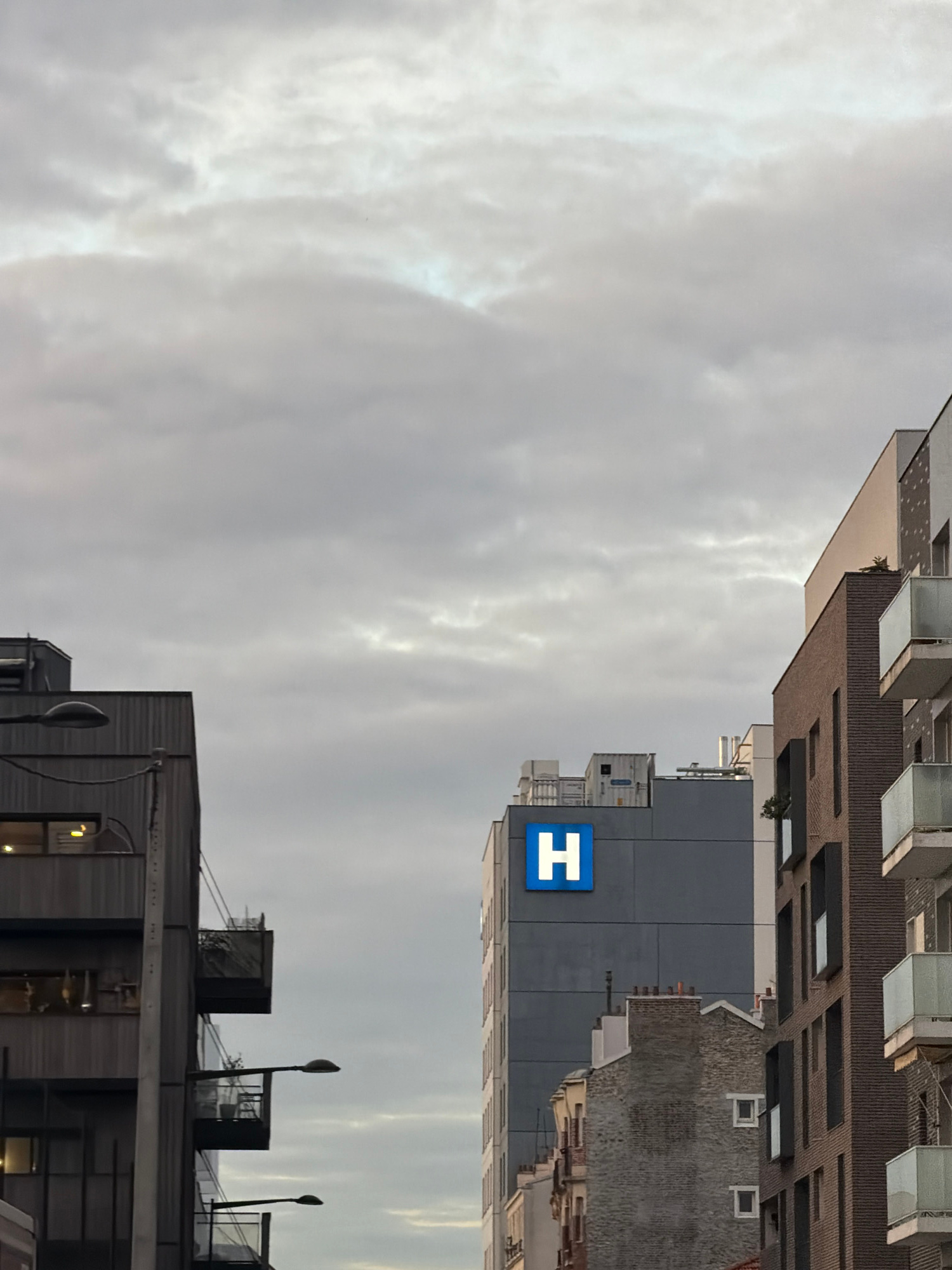 The image depicts a view of the sky above Aubervilliers, France, framed by buildings. In the foreground, the upper portion of a grey building with horizontal lines is visible, punctuated by windows an…read more