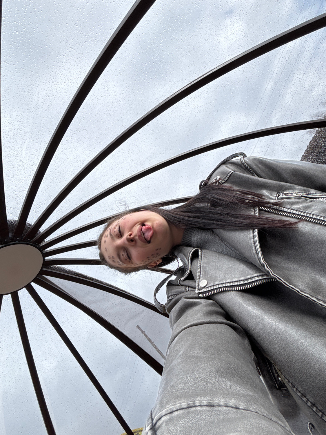 An overhead, upside-down shot captures a young person from the chest up, playfully sticking their tongue out. The individual, likely female, has long, dark hair flowing downwards, framing a face adorn…read more