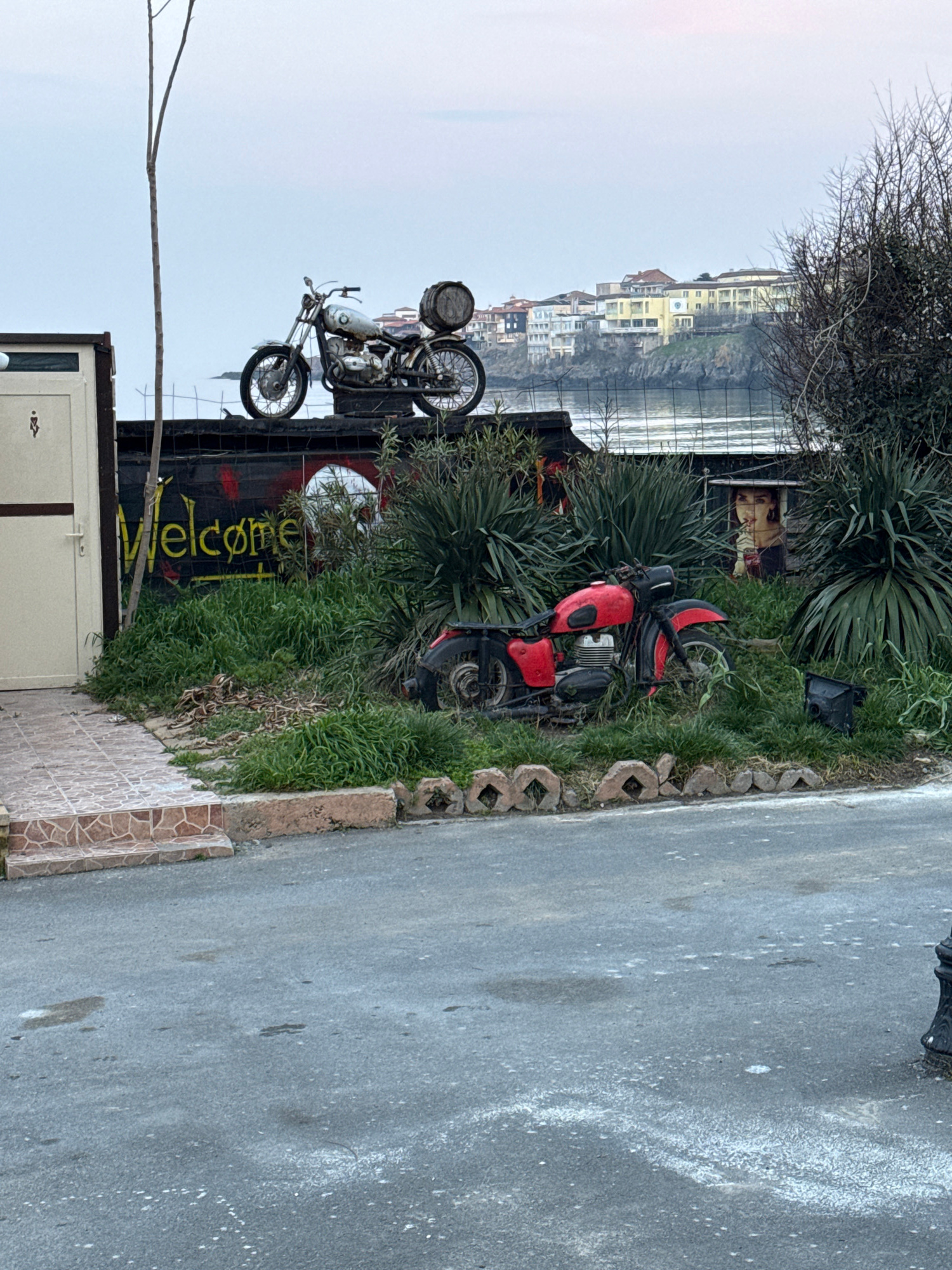 The image shows an outdoor scene with a display featuring motorcycles and a "Welcome" sign, likely in Sozopol, Bulgaria. A black fence is decorated with a vintage motorcycle and two drum-like objects…read more