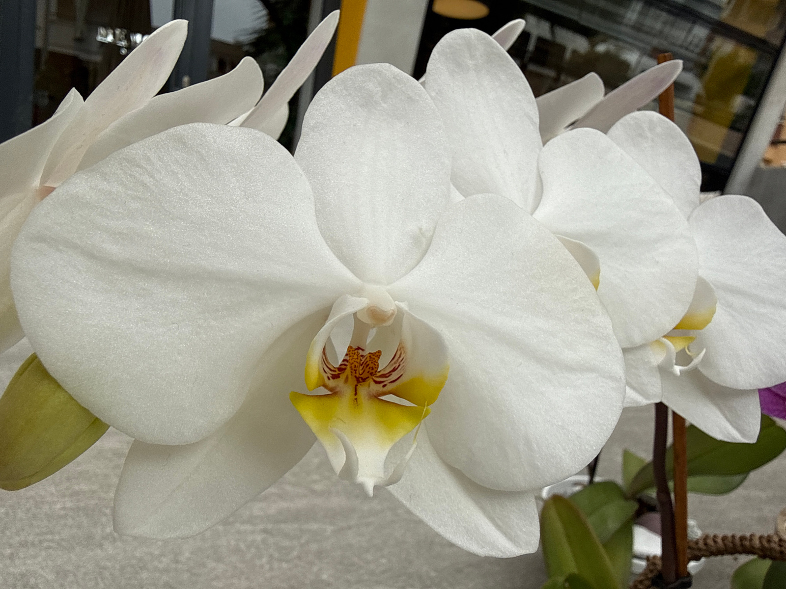 The image displays a close-up, eye-level perspective of a white Phalaenopsis orchid plant, situated indoors in Alanya, Turkey. The central orchid bloom is in sharp focus, revealing five broad white pe…read more
