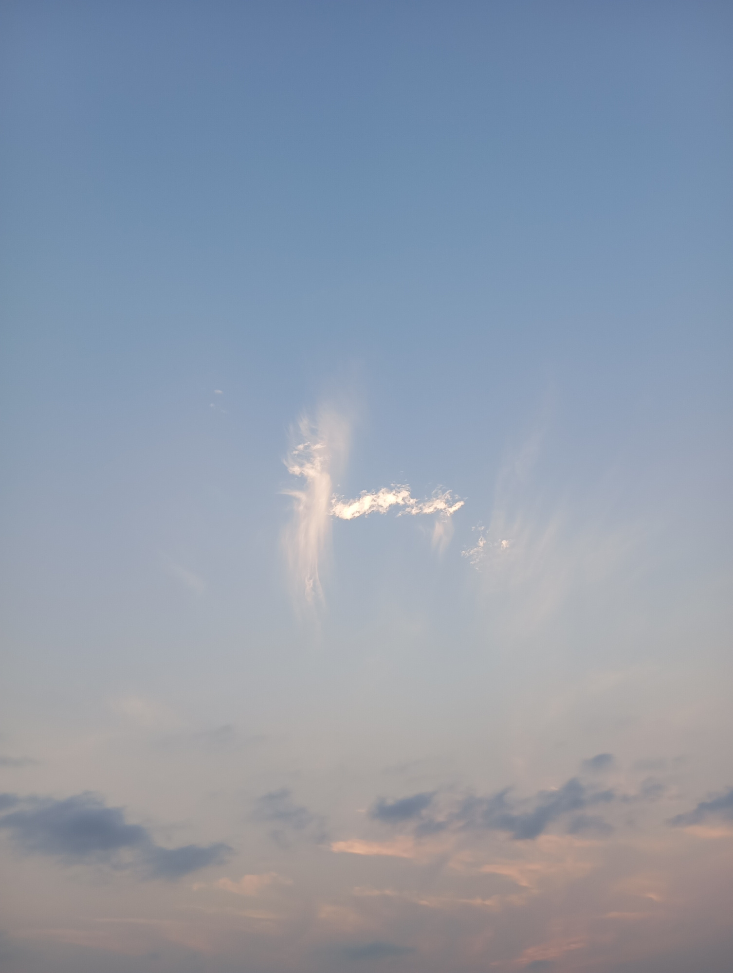 The image shows a sky, likely at dawn or dusk. The top half is a clear, light blue. In the middle, there is a cloud formation that resembles the letter "H," with a denser, brighter cloud in the center…read more