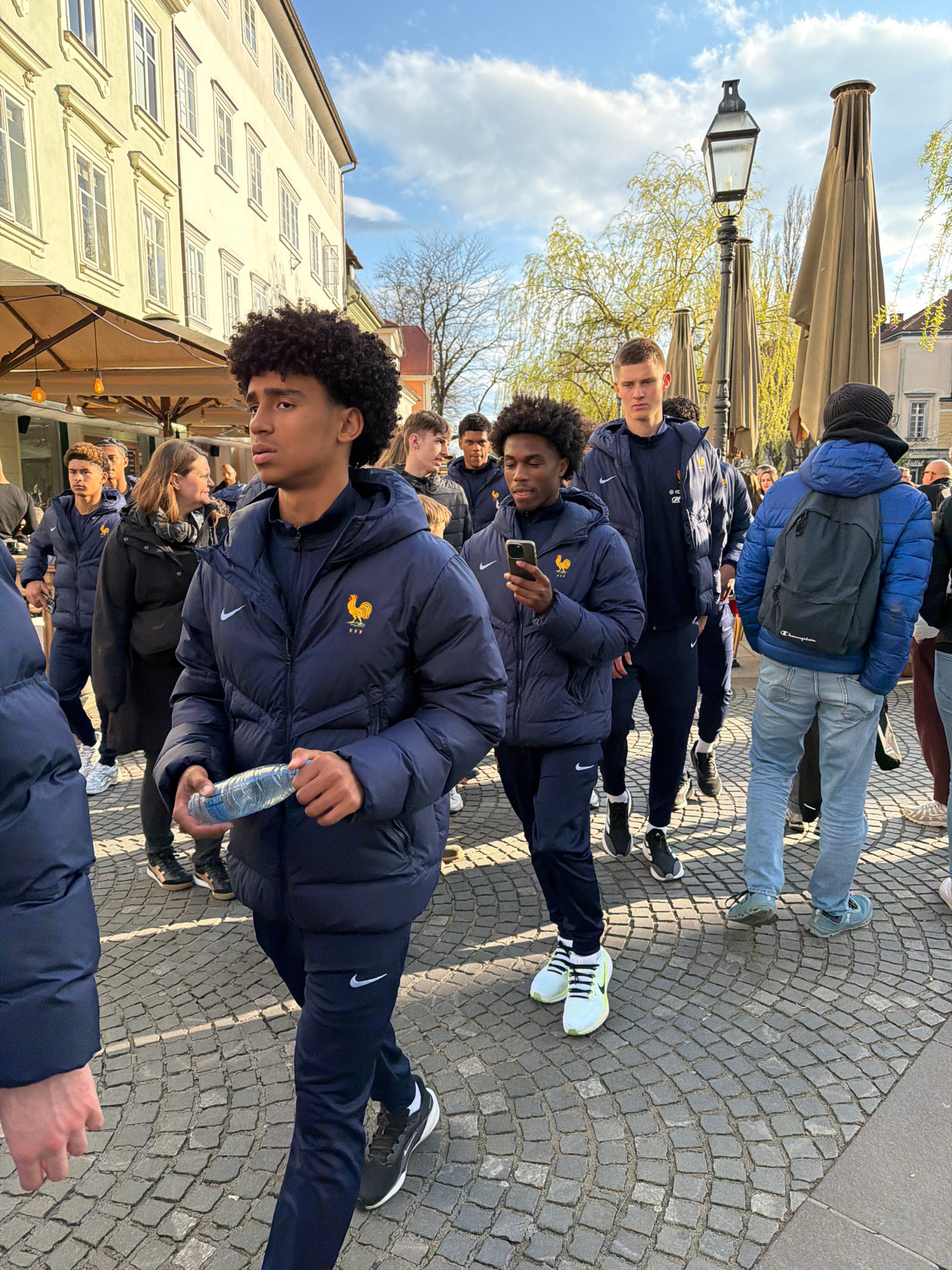 A group of people wearing matching navy blue puffer jackets and track pants with white Nike logos are walking on a cobblestone street. The jackets have a logo featuring a golden rooster and the letter…read more
