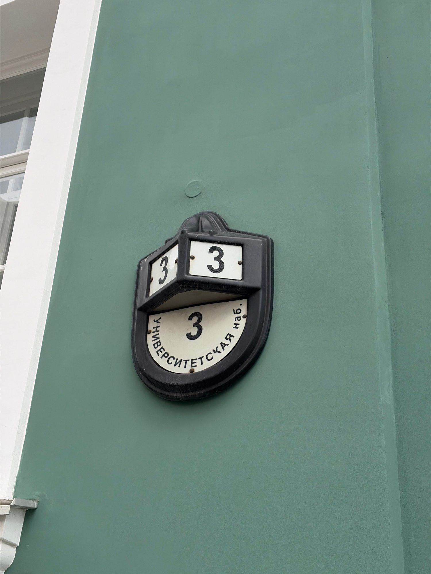 A close-up shows a black house number display attached to a green exterior wall. The display features a rotating number 3 on each of three sides of a rectangular portion. The display also has a curved…read more