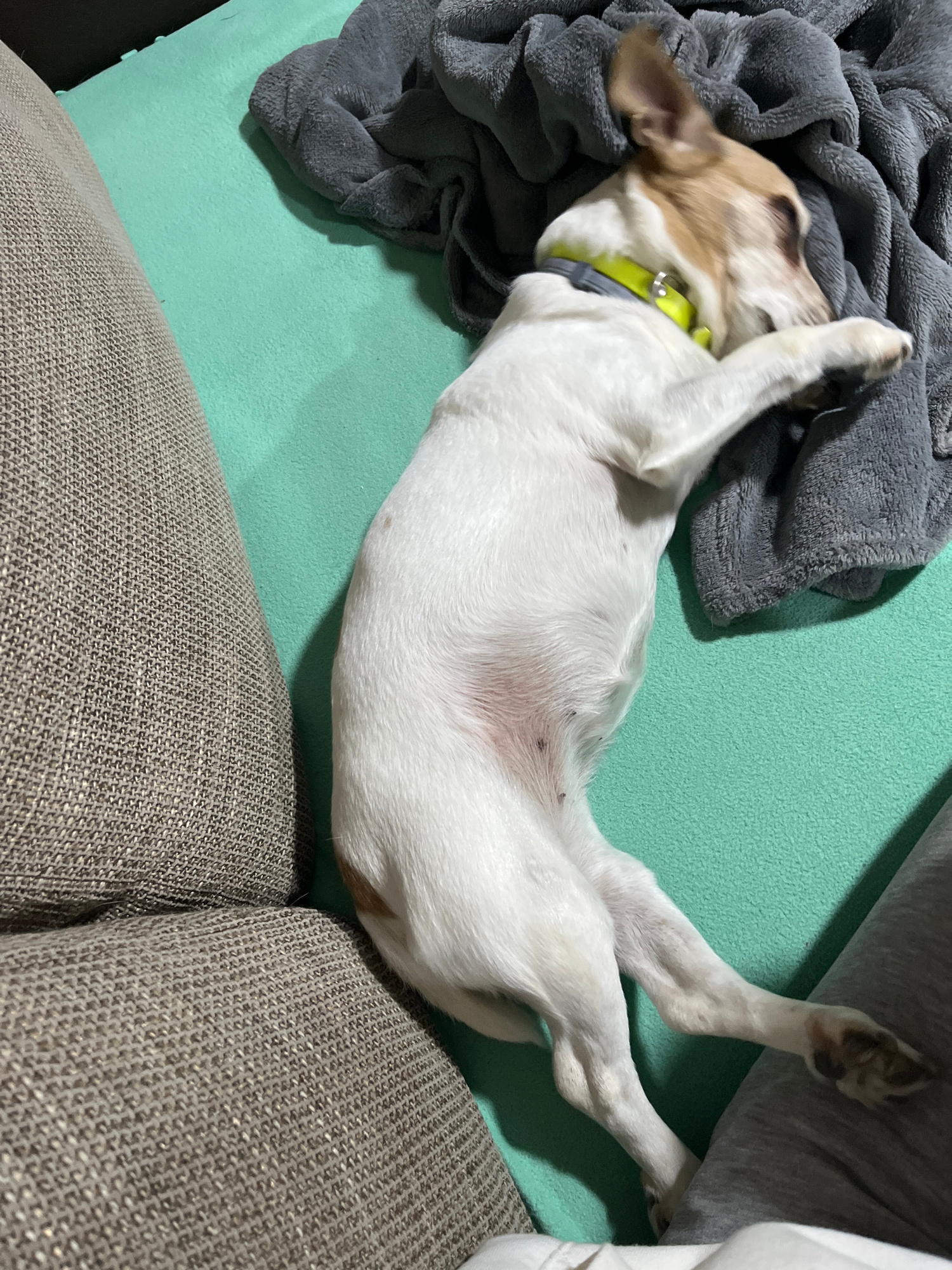 A small, white and tan dog lies on its back on a light green couch, seemingly asleep or relaxed. Its head is tucked near a folded gray blanket, and its legs are extended upwards towards the right edge…read more