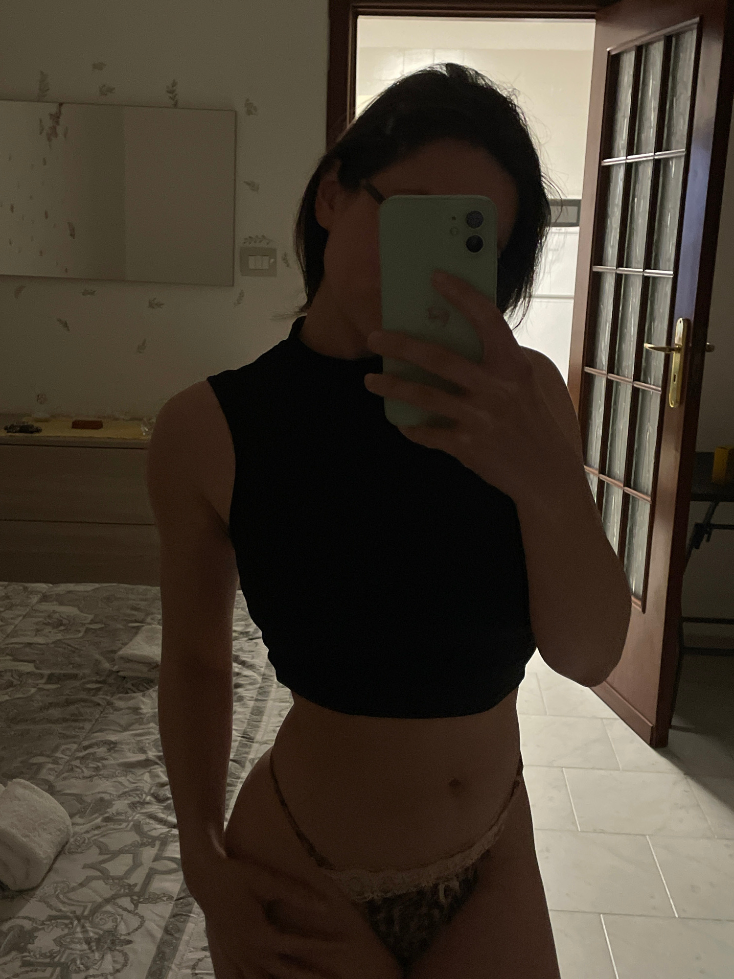 The image depicts an interior scene, located in Ercolano, Italy. A person, appearing to be an adult female, is positioned centrally, capturing their reflection in a mirror using a light green smartpho…read more