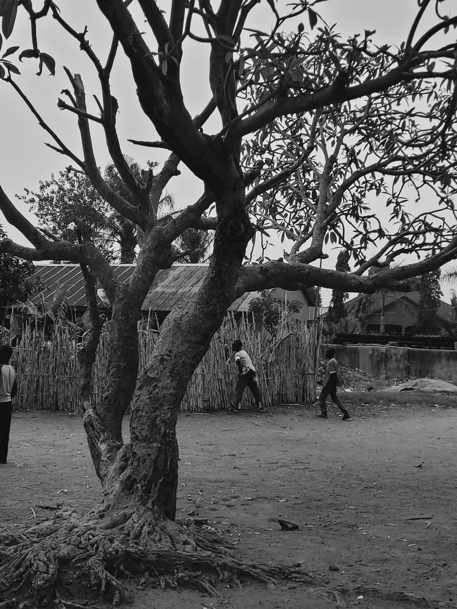 The image depicts an outdoor scene in Udu, Nigeria. A large, leafless tree dominates the foreground, its branches reaching towards the sky. Two people appear in the background, walking past a fence ma…read more