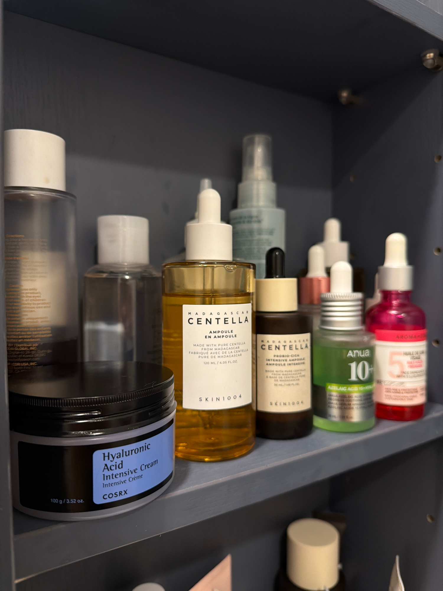 This is a close-up shot of a drawer, likely in a bathroom or vanity, packed with various skincare products. Brands visible include SKIN1004 (Madagascar Centella Ampoule and Probio-Cica Intensive Ampo…read more