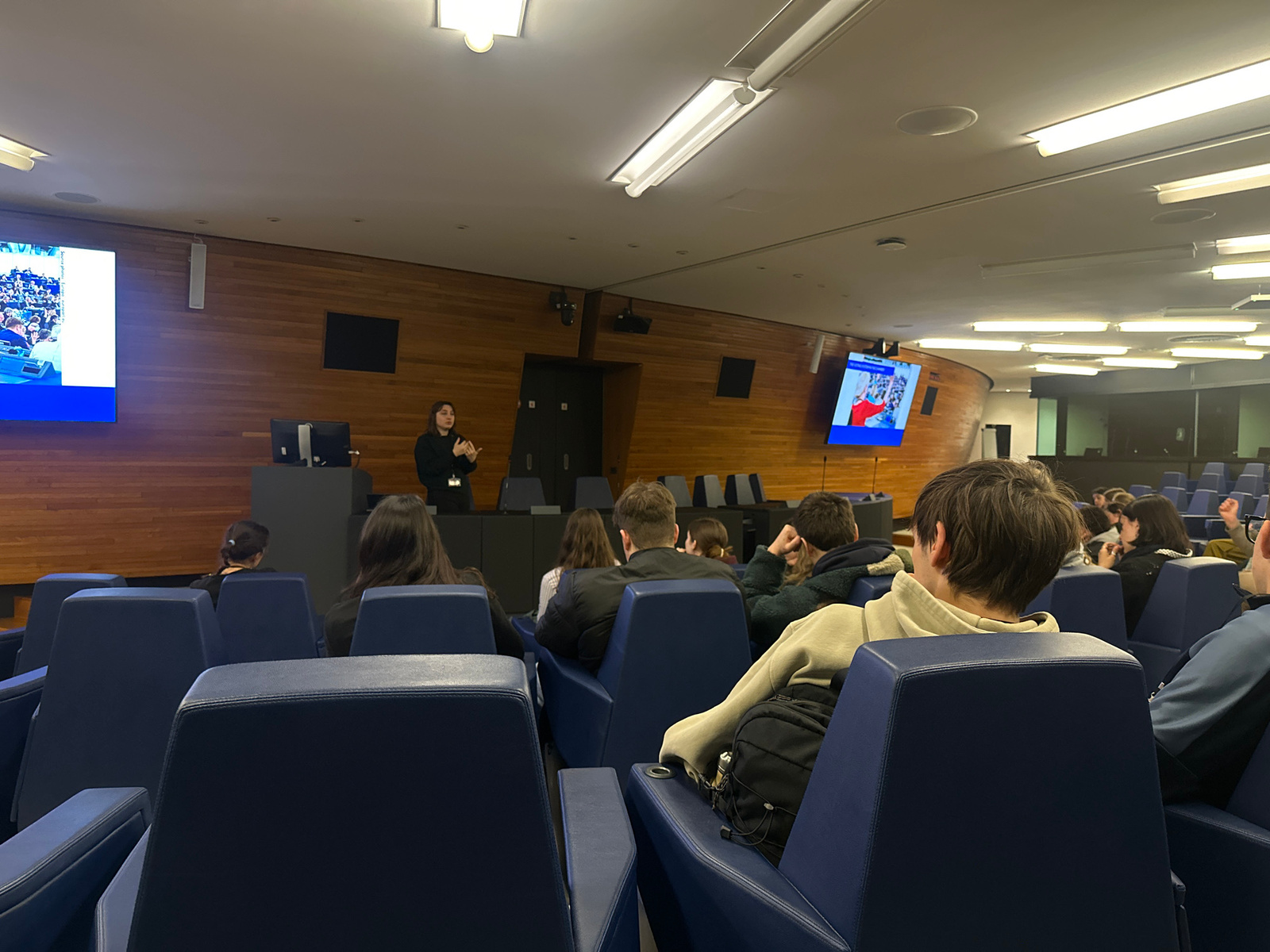 The image captures an indoor lecture or presentation in a modern auditorium, likely located in Strasbourg, France. A speaker, a woman with dark hair wearing a dark top, stands at the front of the room…read more