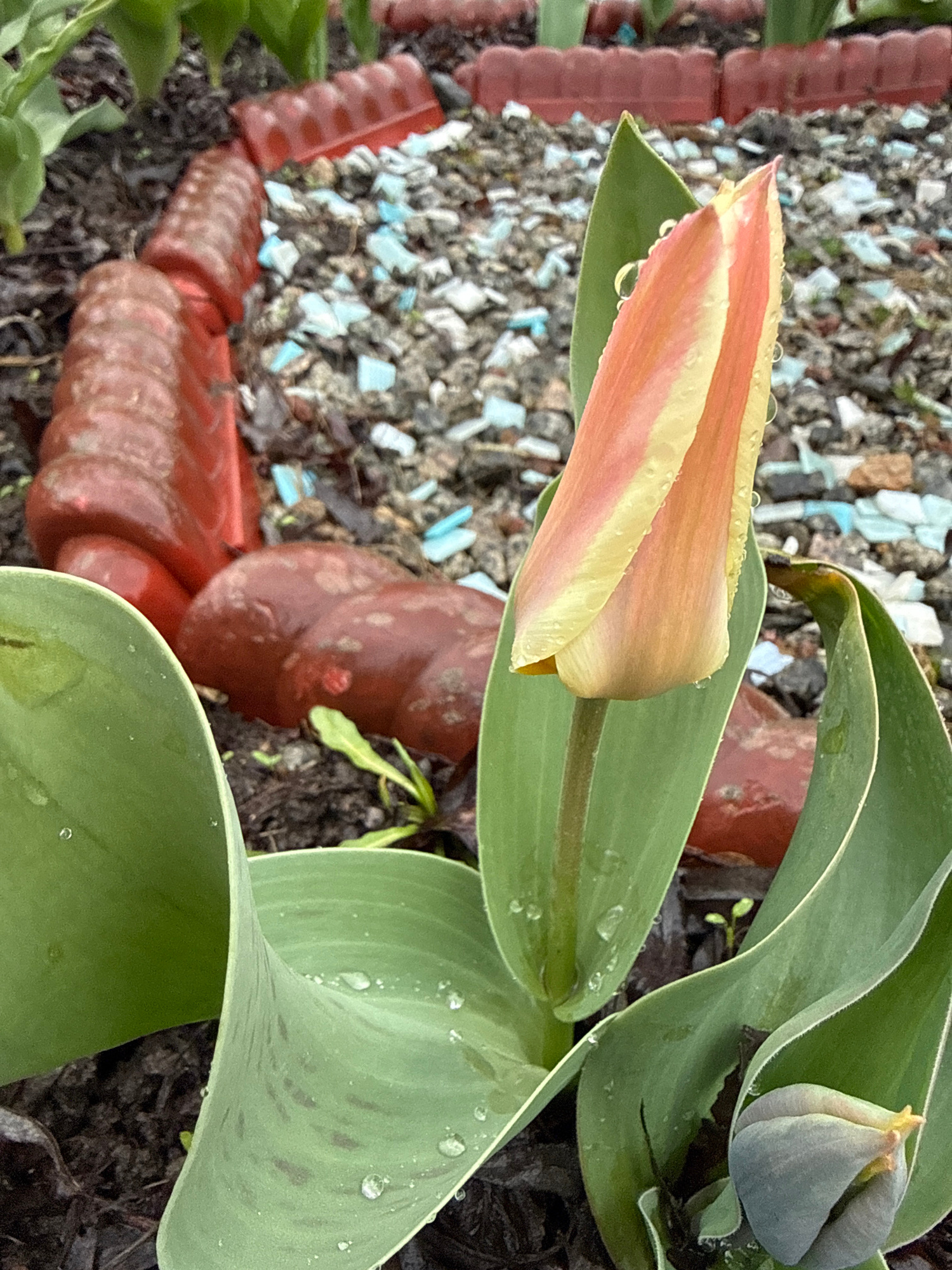 The image depicts two tulip buds emerging from the ground near a red plastic garden edging. One bud is a light peach color with yellow edges and has water droplets on it. The other bud is a dull, clos…read more