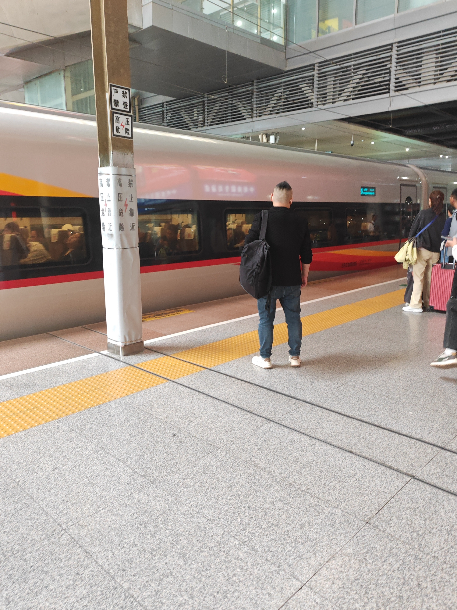 A high-angle shot captures a scene at a train station platform in Yuhuatai District, China, during the daytime. The main subject is a man standing with his back to the camera, wearing a black long-sle…read more