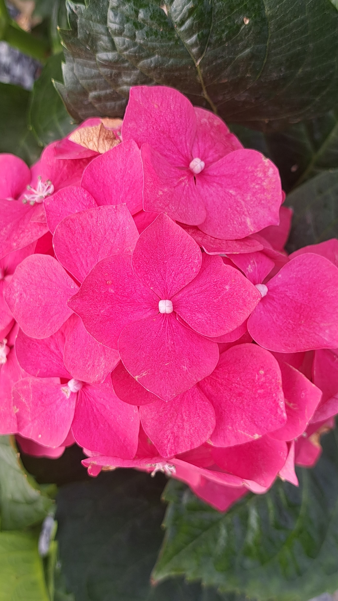 The image shows a close-up view of a vibrant pink hydrangea flower head surrounded by green leaves. The flower is composed of numerous small, four-petaled florets arranged densely together. Each flore…read more