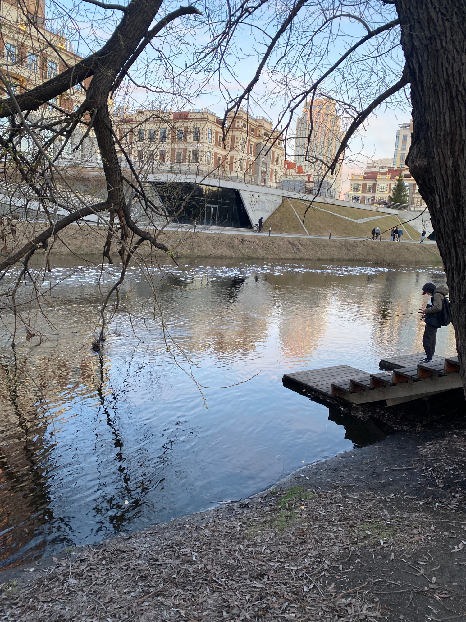 A body of water borders an embankment in what appears to be the city center of Yekaterinburg, Russia. A pedestrian wearing dark clothing and a backpack is fishing off a wooden platform attached to the…read more