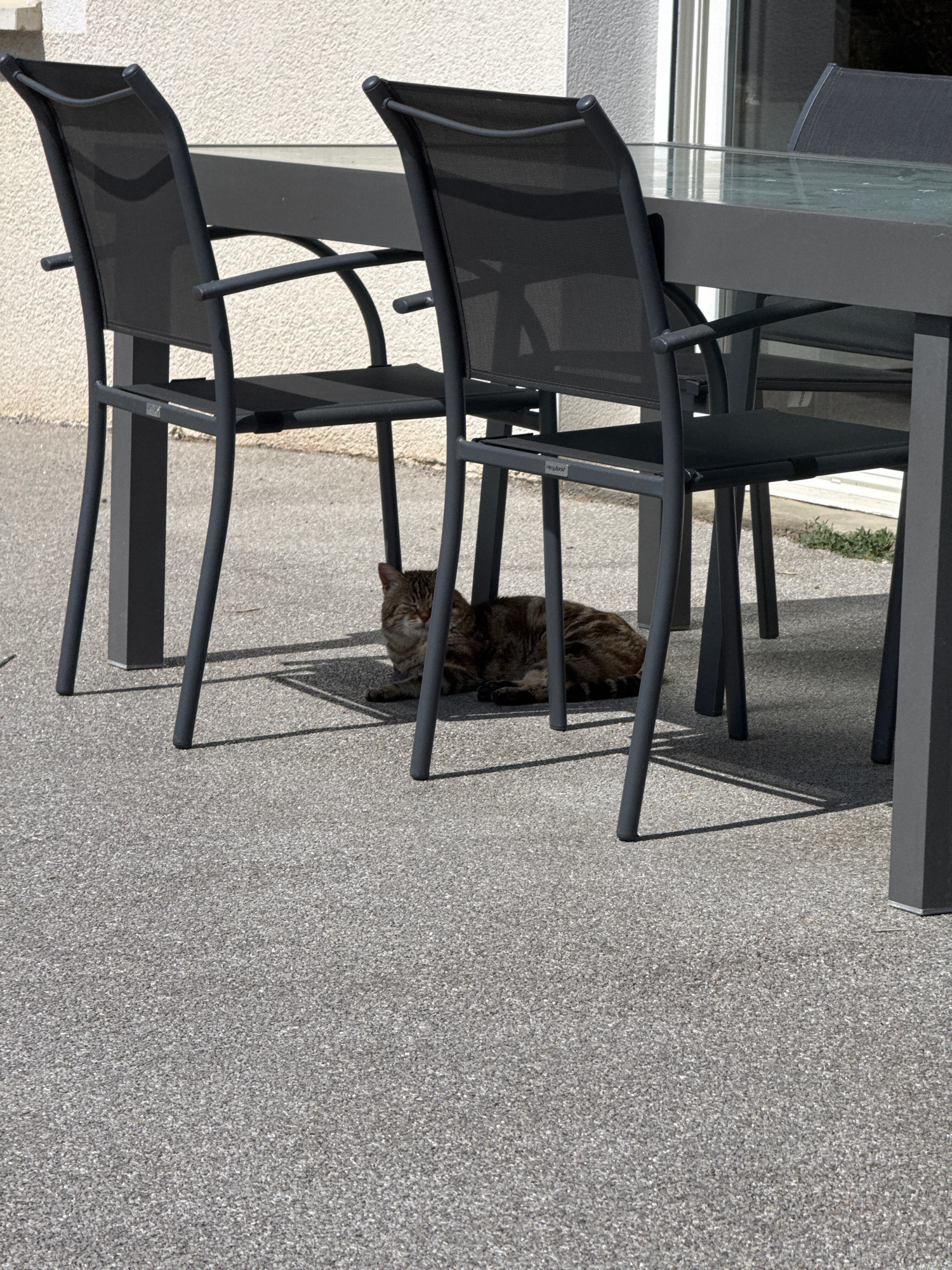 A tabby cat is resting under a gray metal patio chair on a gray patio, likely in Veauchette, France. The chair is part of a set with a glass-topped table and additional chairs. The scene is illuminate…read more