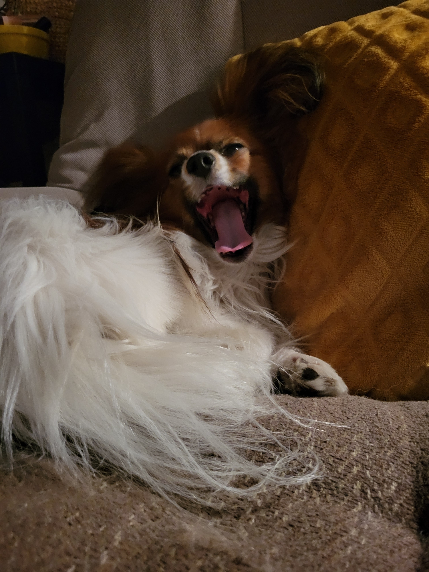 A papillon dog lies on its back on a sofa, appearing to yawn. The dog's head is turned towards the camera with its mouth wide open, revealing its tongue and teeth. The dog's fur is a mix of white and…read more