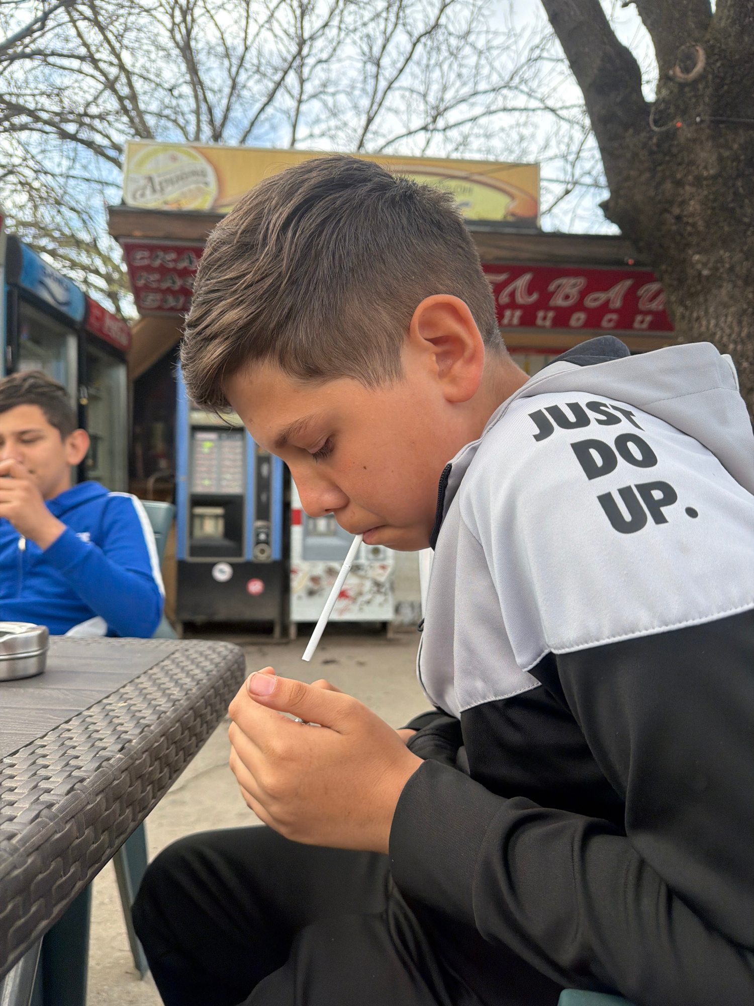 A youth wearing a grey and black hooded sweatshirt that says "Just Do Up" is shown from the side, with a white stick or straw held to his mouth. He appears to be sitting at a table. Another individual…read more