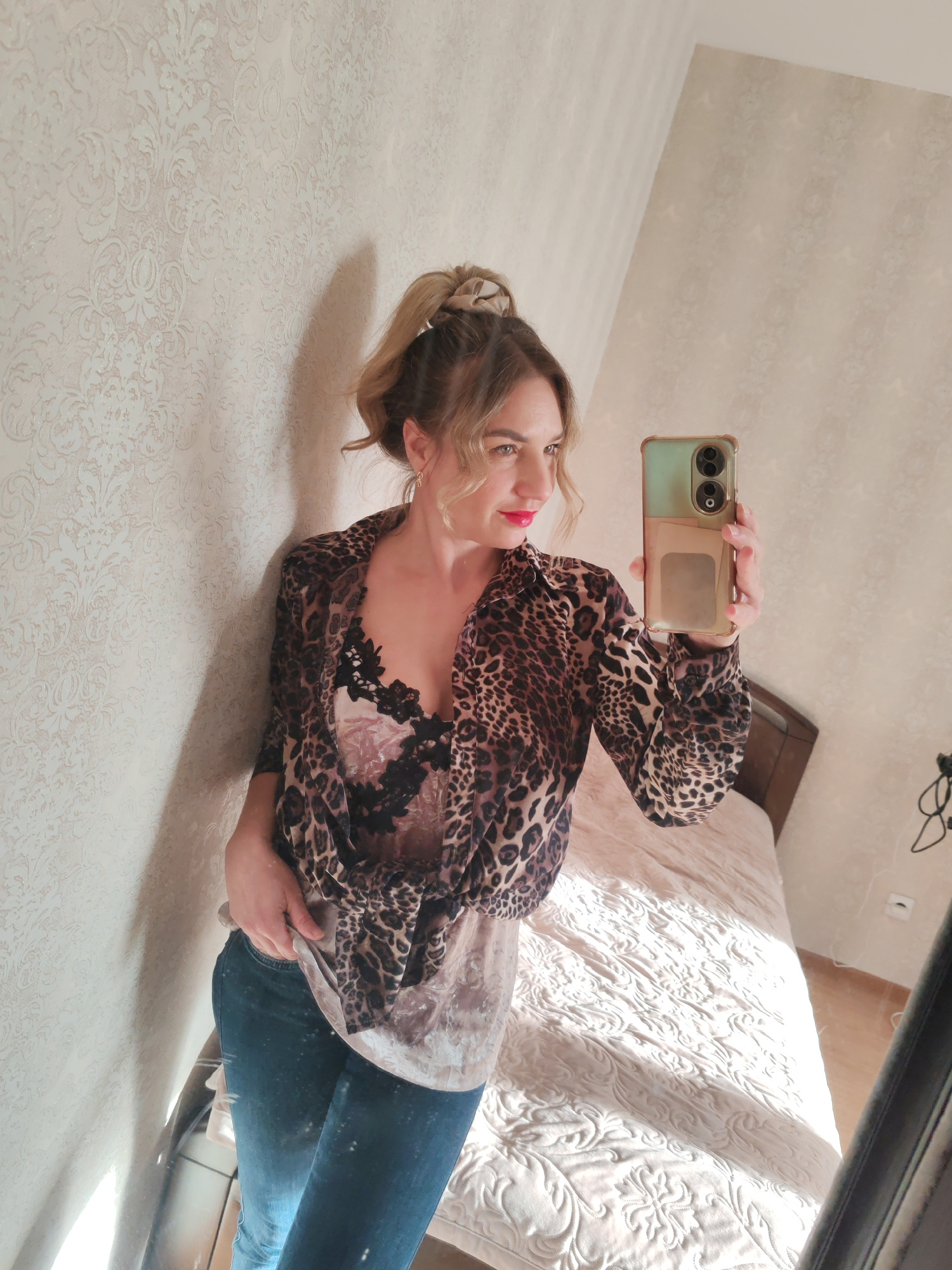A woman is taking a mirror selfie in a room with light beige wallpaper. She is wearing a leopard-print shirt over a black lace top and blue jeans. Her hair is pulled back in a high ponytail with a bei…read more