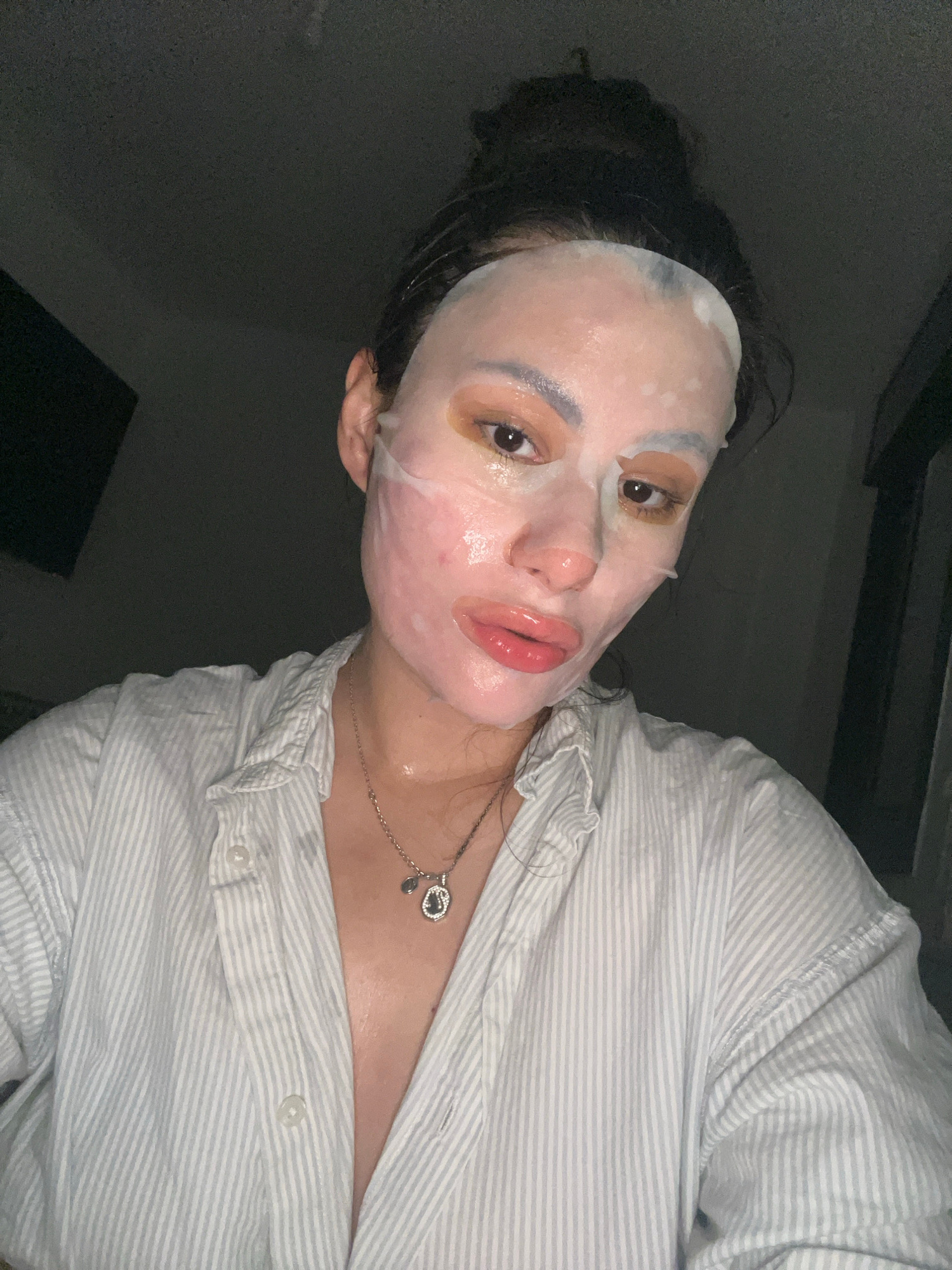 A single individual is depicted in a close-up, dimly lit indoor setting identified as Kiryat Bialik, Israel. The subject, an adult female, is facing the camera directly, capturing what appears to be a selfie. Her dark hair is pulled back, and her face is covered by a translucent sheet mask, which has cutouts for the eyes, nostrils, and mouth. The mask appears moist, with small surface irregularities. Her eyes are open, revealing dark irises and eyelids adorned with a brownish-gold eyeshadow. Her lips are visible through the mask's opening, appearing full and glossy with a reddish tint. The skin around the mask and visible areas shows a slightly flushed complexion. She is wearing a light-colored, vertically striped, collared button-down shirt, unbuttoned to reveal the upper chest. A silver-colored chain necklace with two pendants is worn around her neck; one pendant is small and dark, the other is larger, oval-shaped, and features a detailed design. The background is dark and largely undifferentiated, with a dark rectangular object partially visible on the left side. | Open Wire